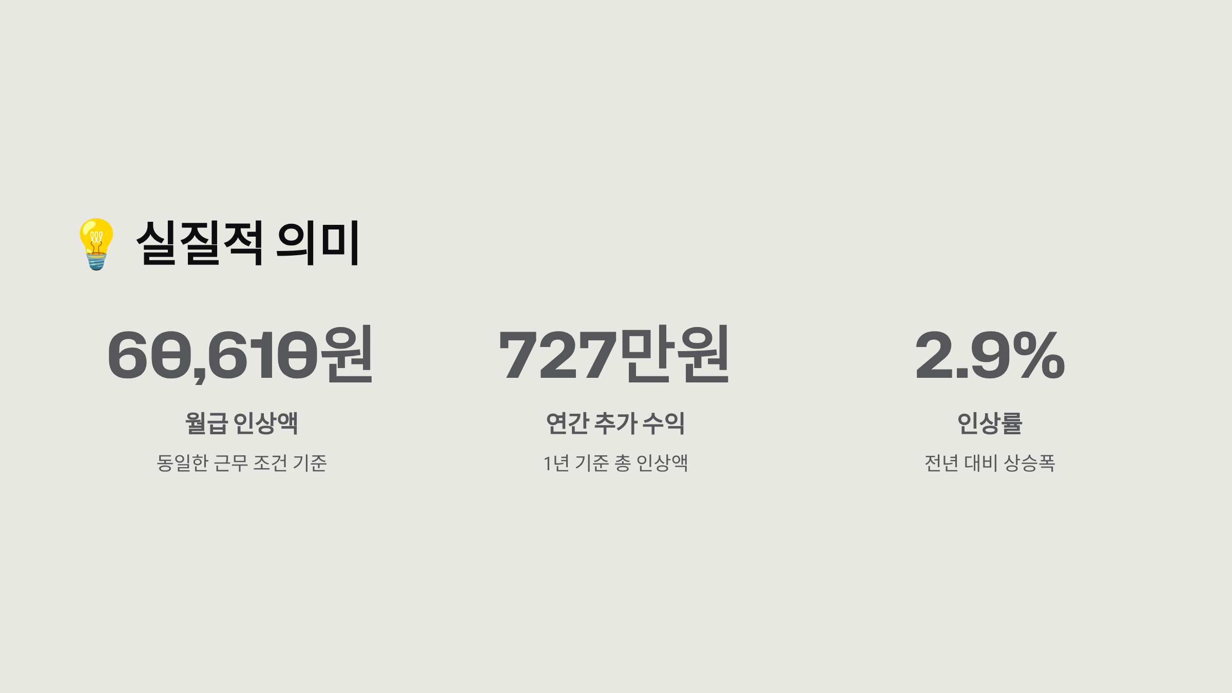 💡 의미하는 바: 동일한 근무 시간과 조건이라면, 올해 대비 월급이 약 60,610원 인상됩니다. 이는 연간 약 727만원의 추가 수익입니다.
