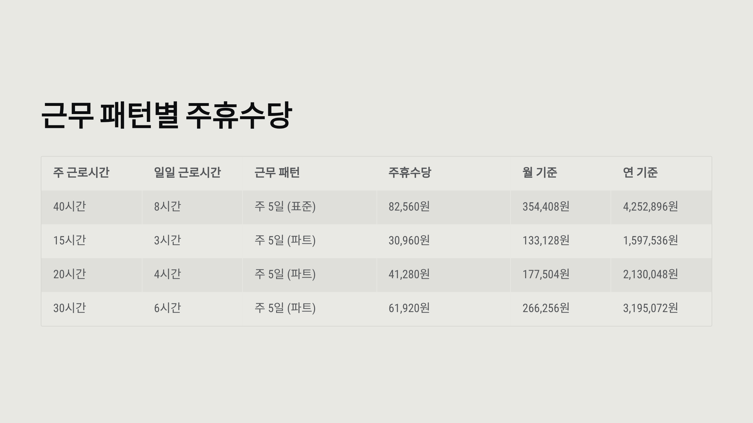 | 40시간 | 8 | 주 5일 | 82,560원 | 354,408원 | 4,252,896원 |