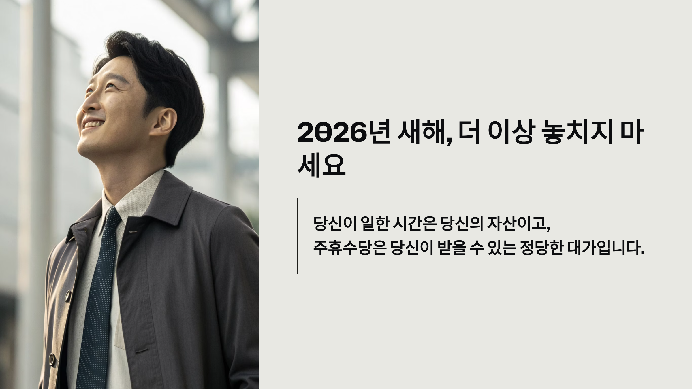 2026년 새해, 더 이상 주휴수당을 놓치지 마세요. 당신이 일한 시간은 당신의 자산이고, 주휴수당은 당신이 받을 수 있는 정당한 대가입니다.