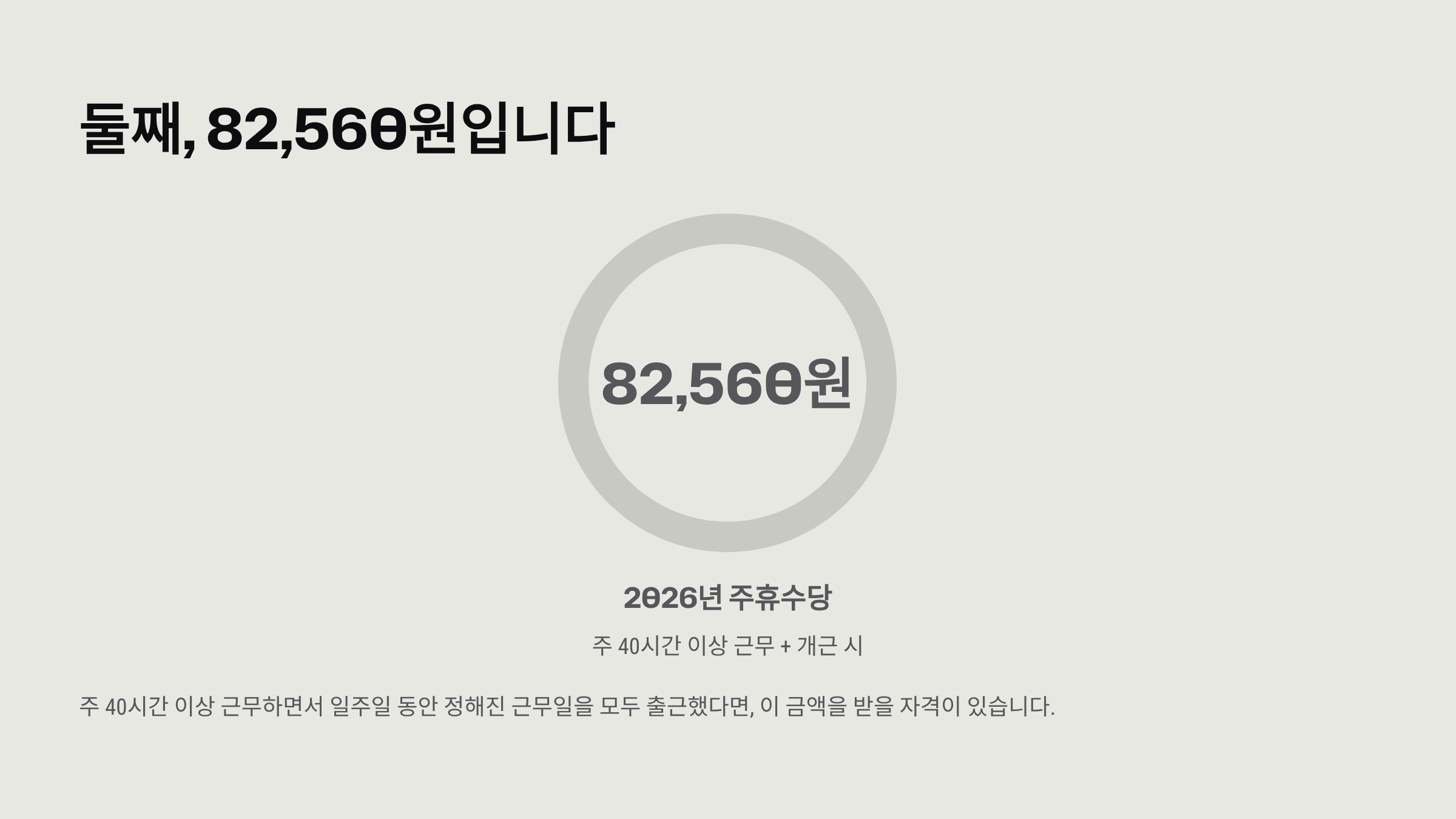 둘째, 2026년 주휴수당은 82,560원입니다. 주 40시간 이상 근무하면서 일주일 동안 정해진 근무일을 모두 출근했다면, 이 금액을 받을 자격이 있습니다.