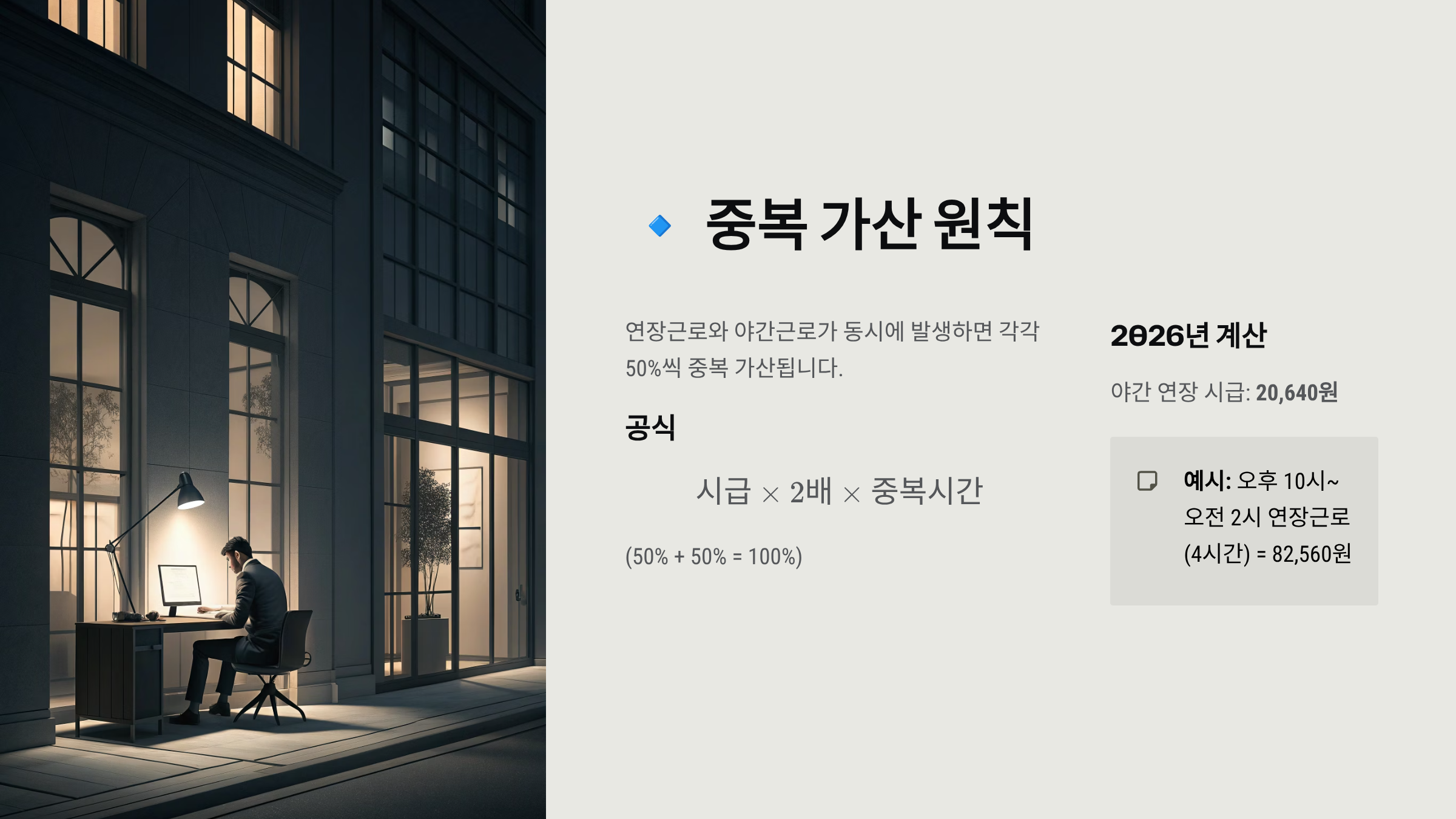 공식: 시급 × 2배 × 중복시간 (50% + 50% = 100%)