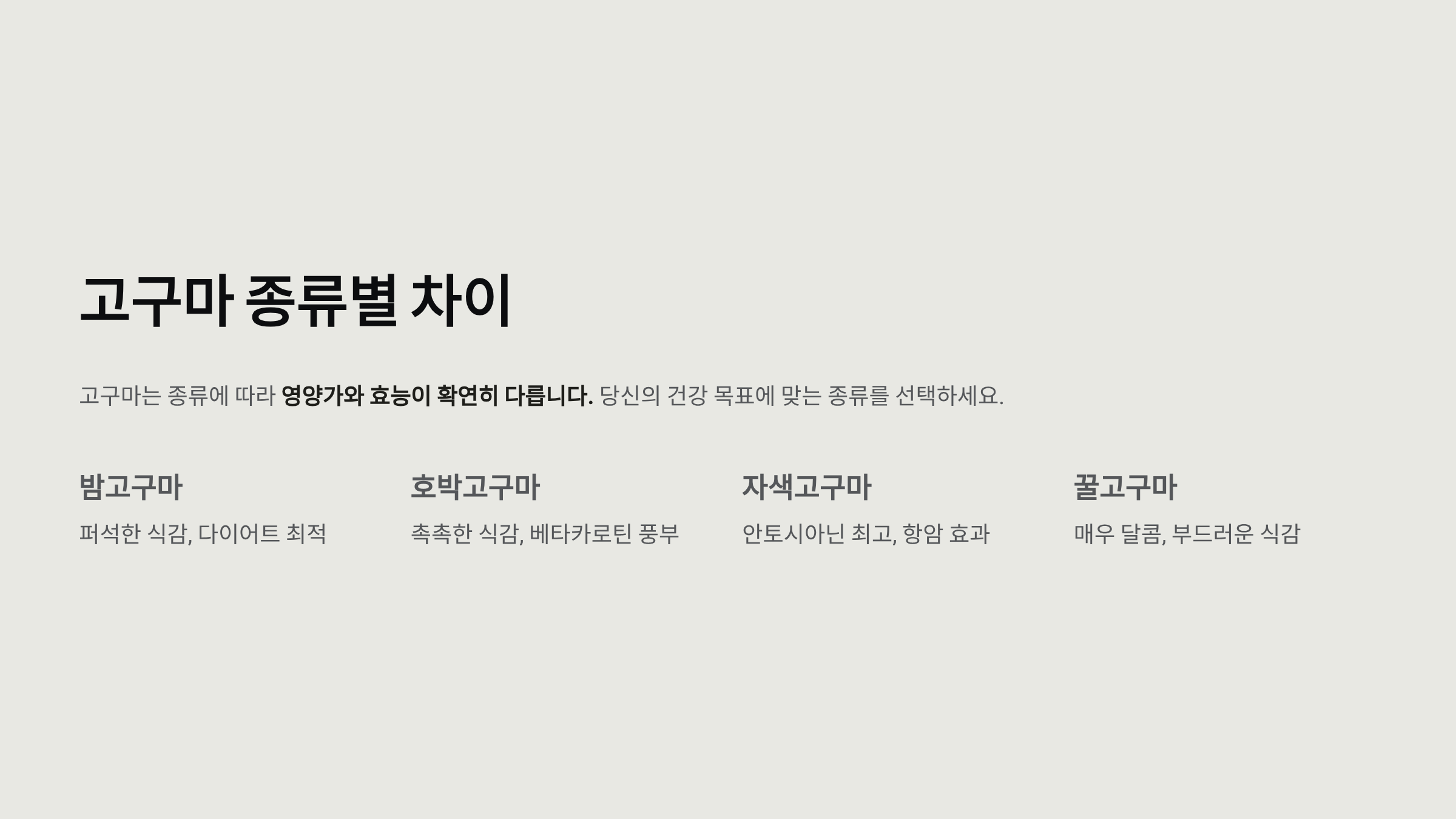 고구마는 종류에 따라 영양가와 효능이 확연히 다릅니다. 당신의 건강 목표에 맞는 종류를 선택하세요.