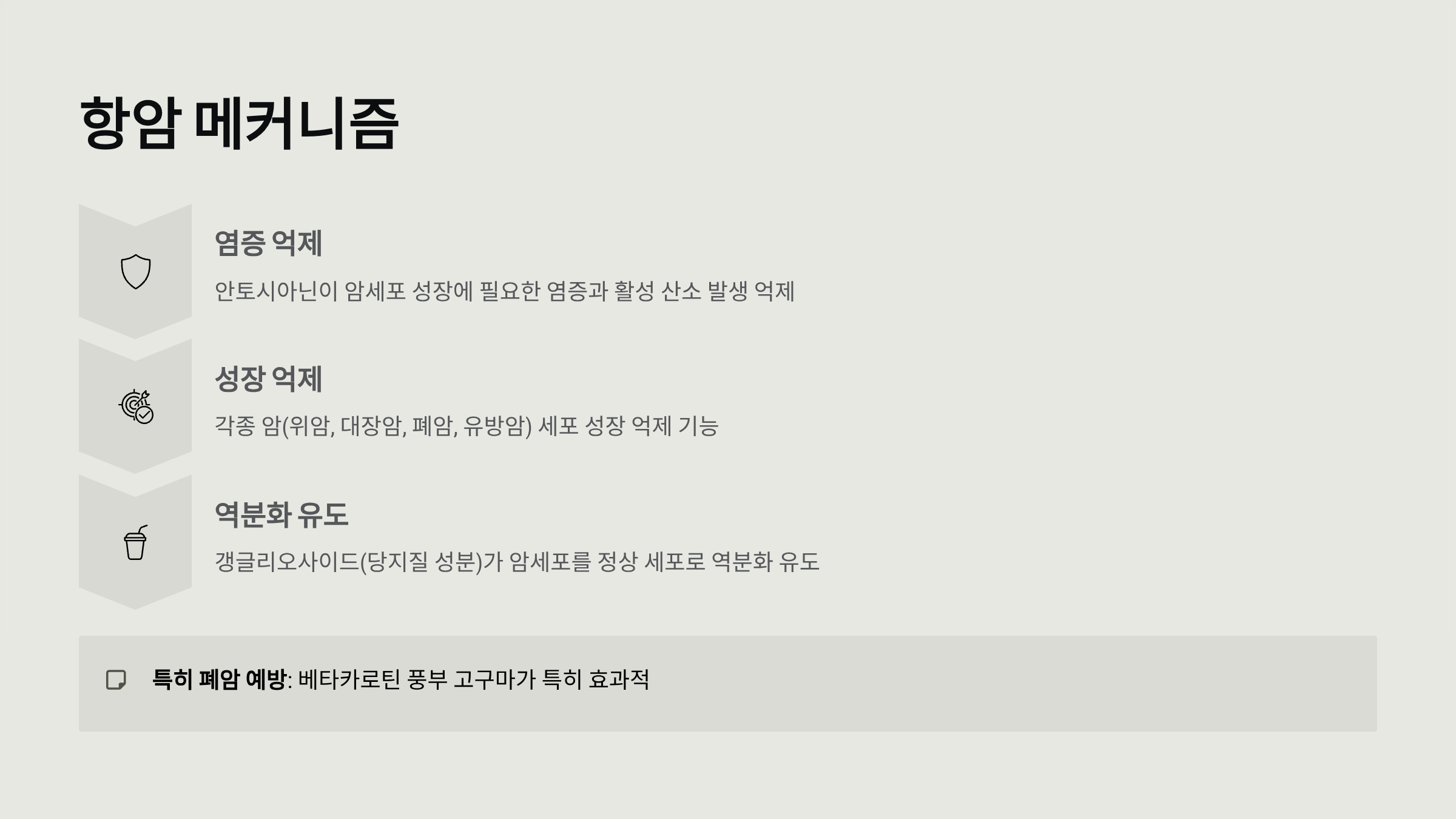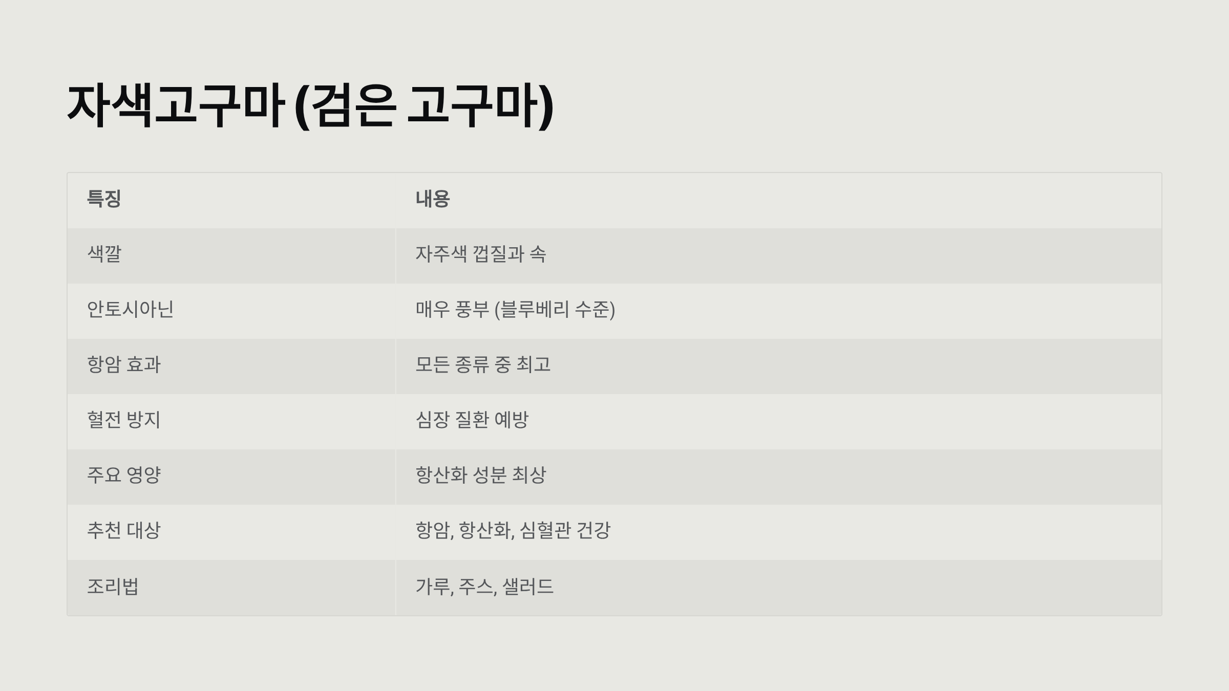 - 안토시아닌: 특히 자색 고구마에 풍부, 활성 산소 제거