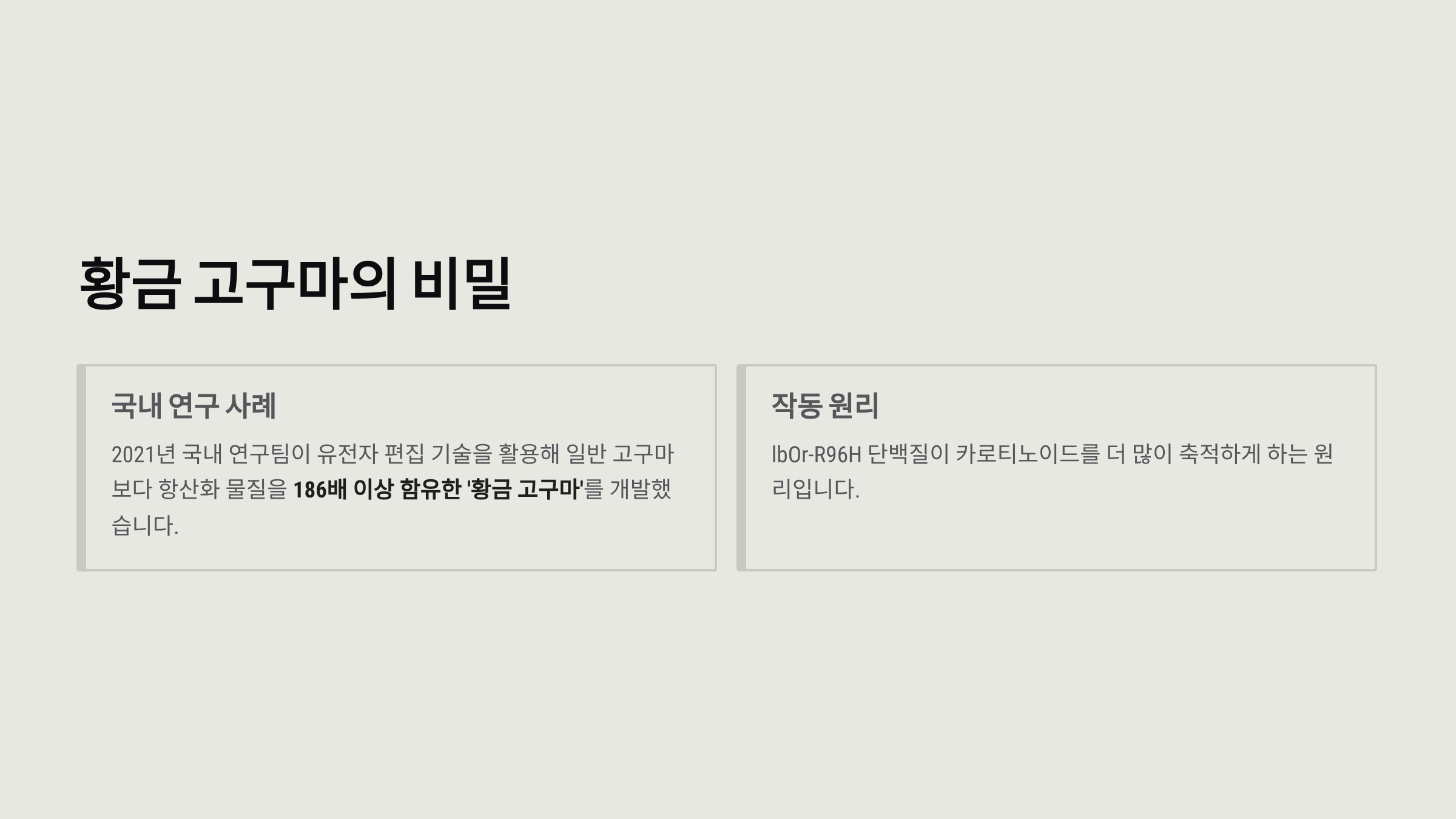 국내 연구 사례: 2021년 국내 연구팀이 유전자 편집 기술을 활용해 일반 고구마보다 항산화 물질을 **186배 이상 함유한 '황금 고구마'**를 개발했습니다. lbOr-R96H 단백질이 카로티노이드를 더 많이 축적하게 하는 원리입니다.