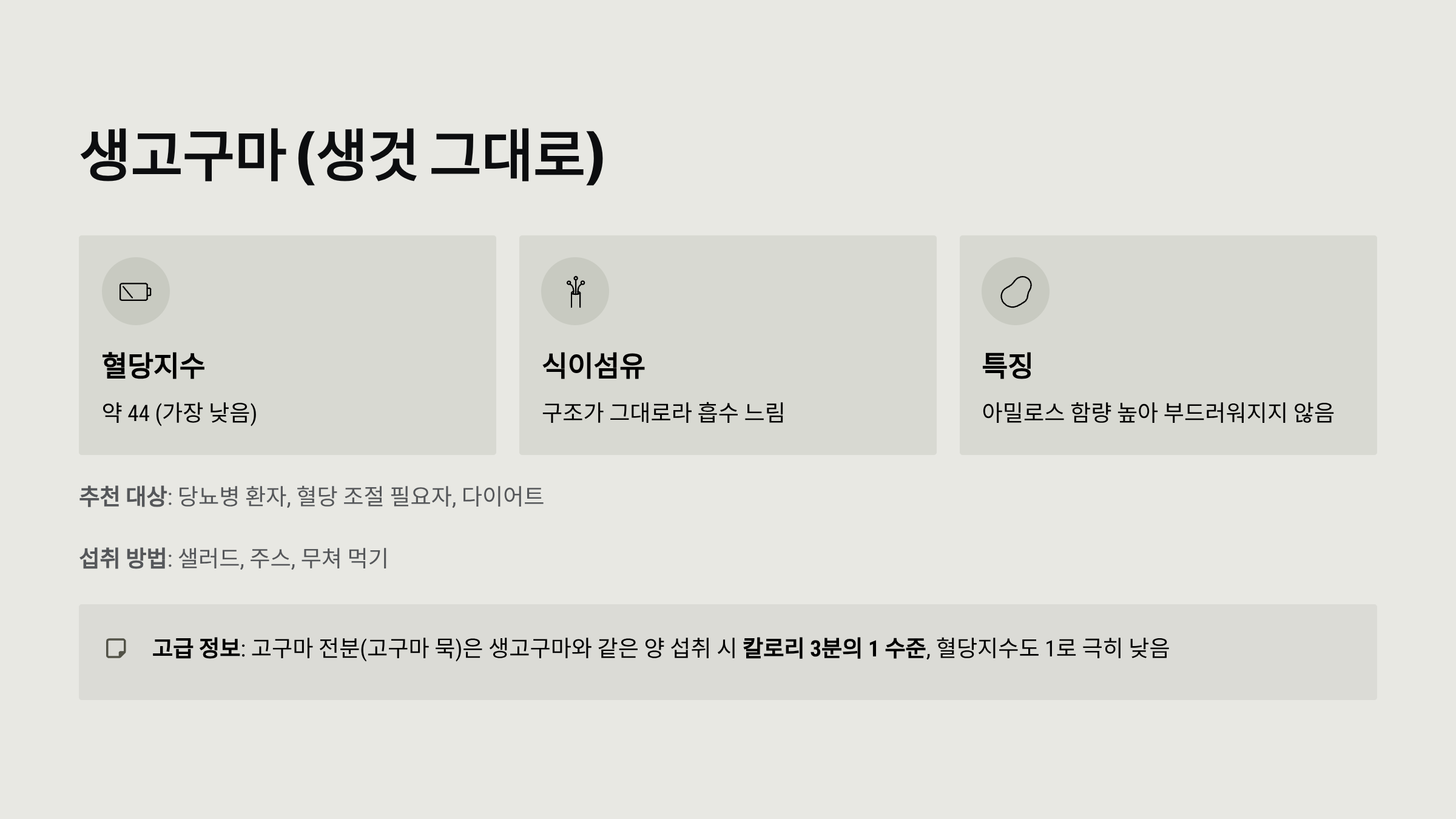 - 주의사항: 당뇨 환자는 생고구마 추천