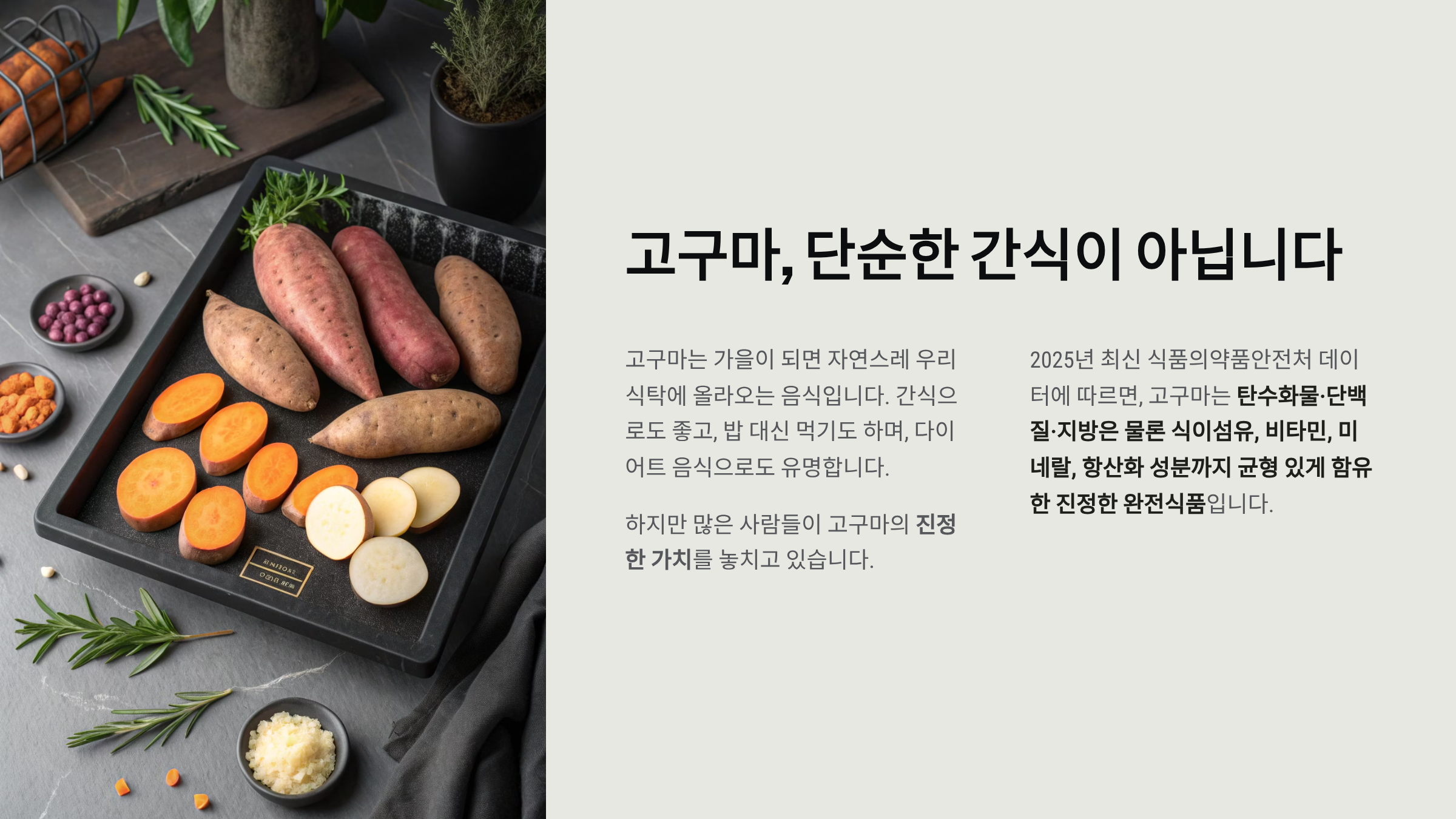 고구마는 가을이 되면 자연스레 우리 식탁에 올라오는 음식입니다. 간식으로도 좋고, 밥 대신 먹기도 하며, 다이어트 음식으로도 유명합니다. 하지만 많은 사람들이 고구마의 진정한 가치를 놓치고 있습니다. 2025년 최신 식품의약품안전처 데이터에 따르면, 고구마는 단순한 탄수화물 음식이 아니라 탄수화물·단백질·지방은 물론 식이섬유, 비타민, 미네랄, 항산화 성분까지 균형 있게 함유한 진정한 영양 밀도 높은 완전식품입니다. 특히 항산화 물질이 블루베리에 필적할 정도로 풍부하다는 사실을 아시나요?