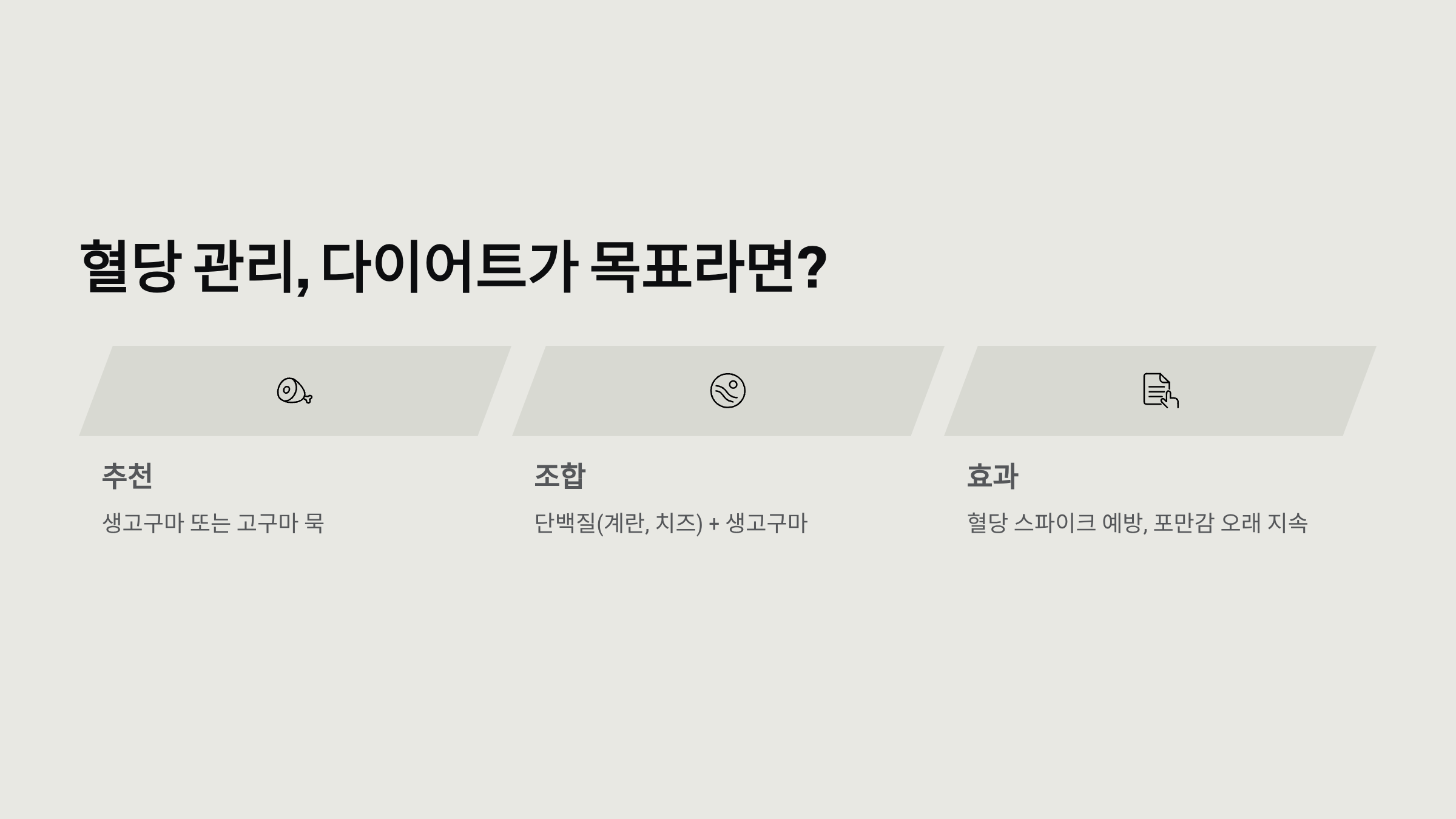 - 추천: 생고구마 (혈당지수 44) 또는 고구마 묵 (혈당지수 1)