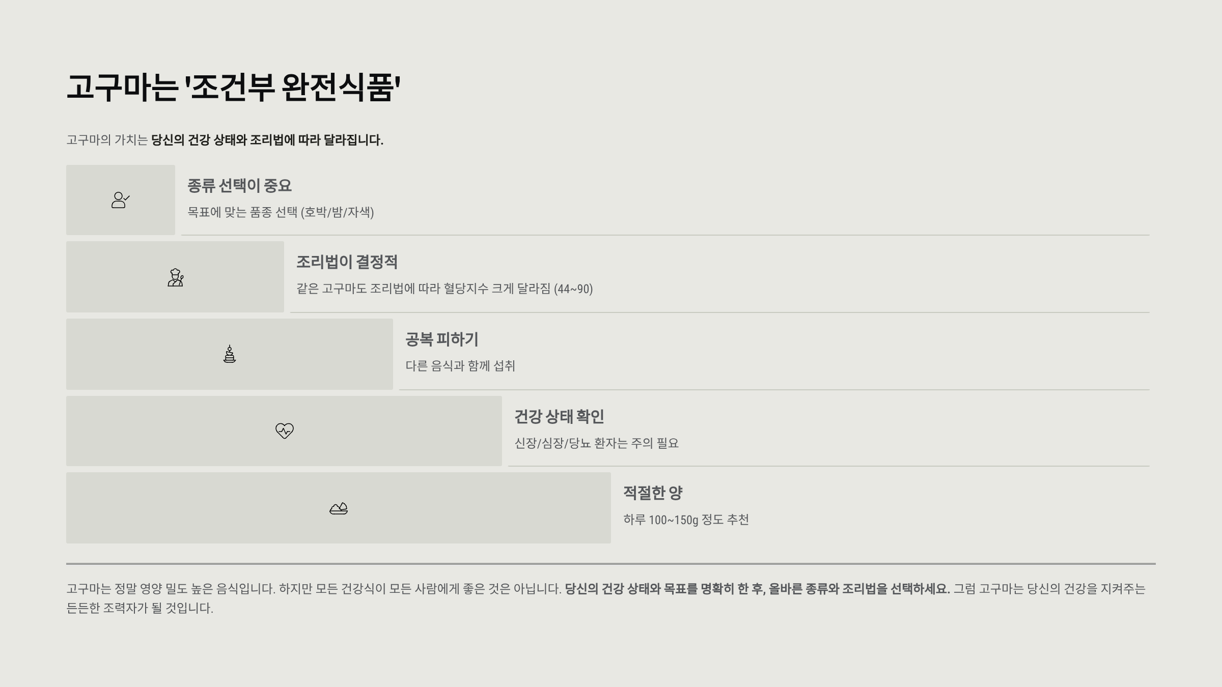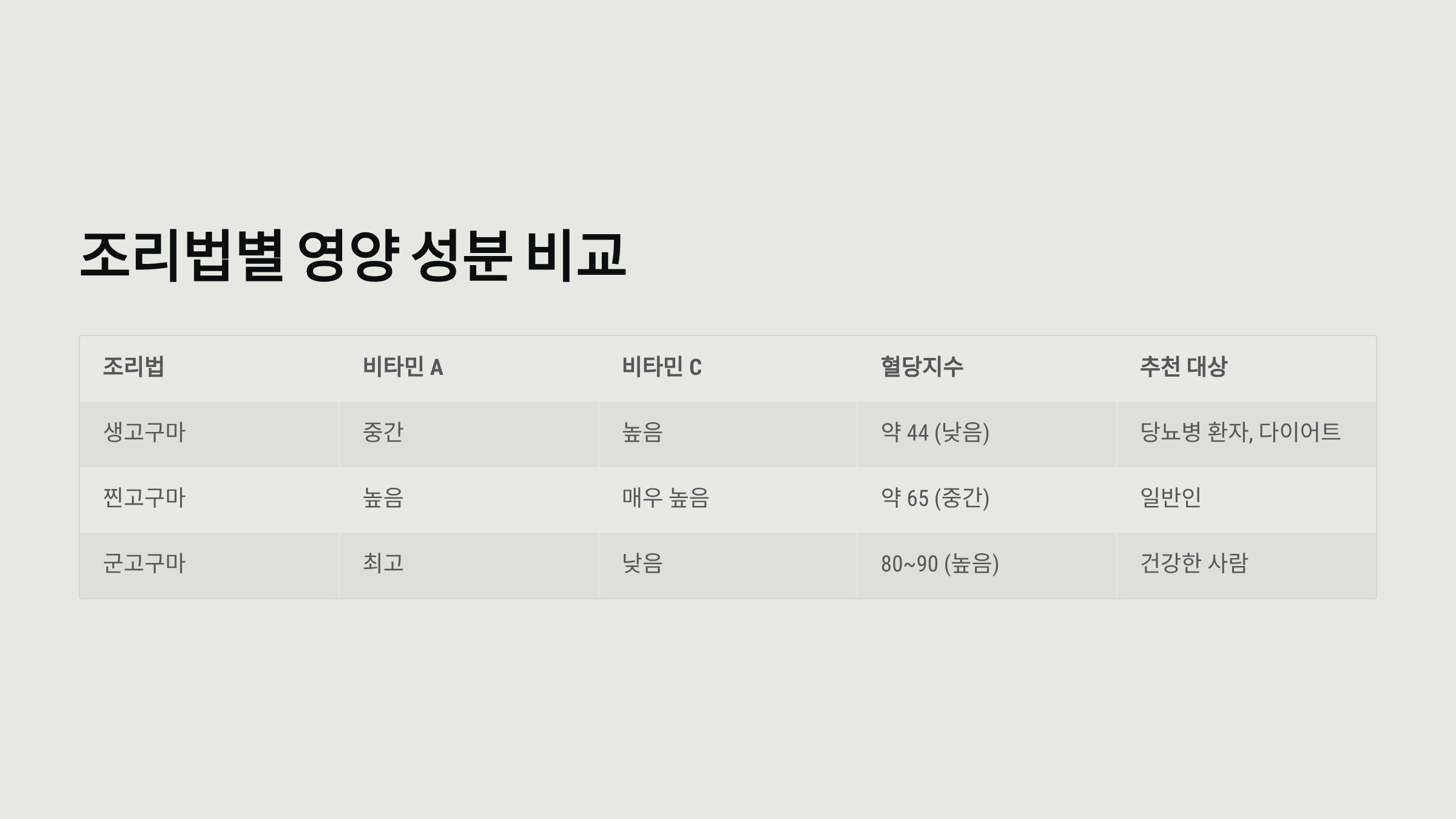 - ✅ 조리법이 결정적: 같은 고구마도 조리법에 따라 혈당지수 크게 달라짐 (44~90)