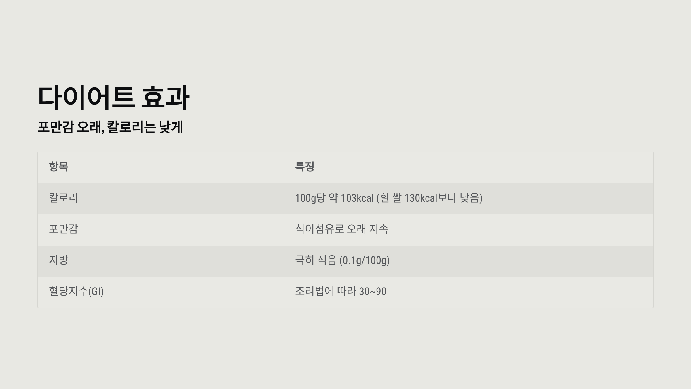 | 식이섬유 | 2.4g | 쌀의 약 10배, 포만감 오래 유지 |