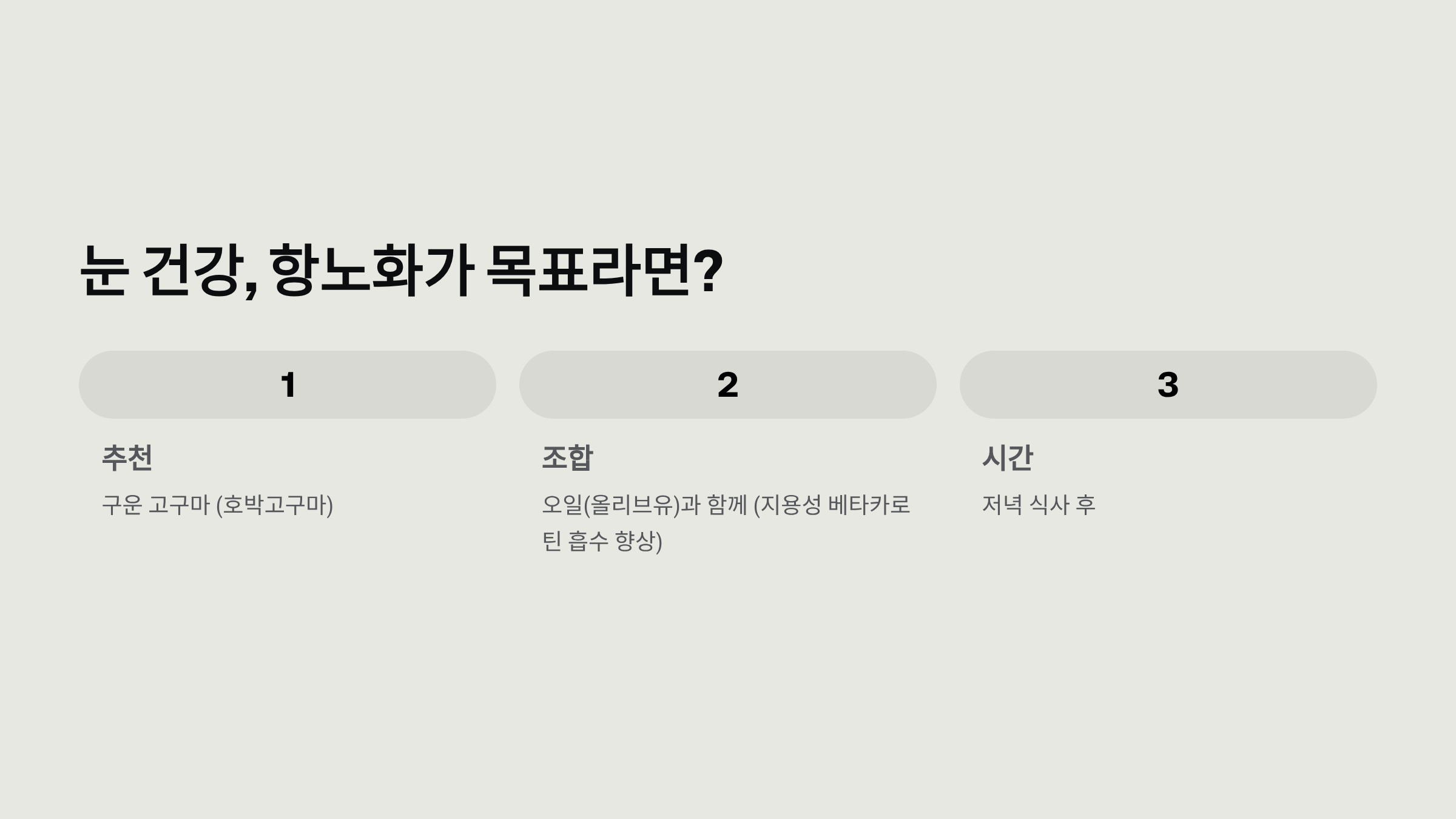 - 조합: 오일(올리브유)과 함께 (지용성 베타카로틴 흡수 향상)