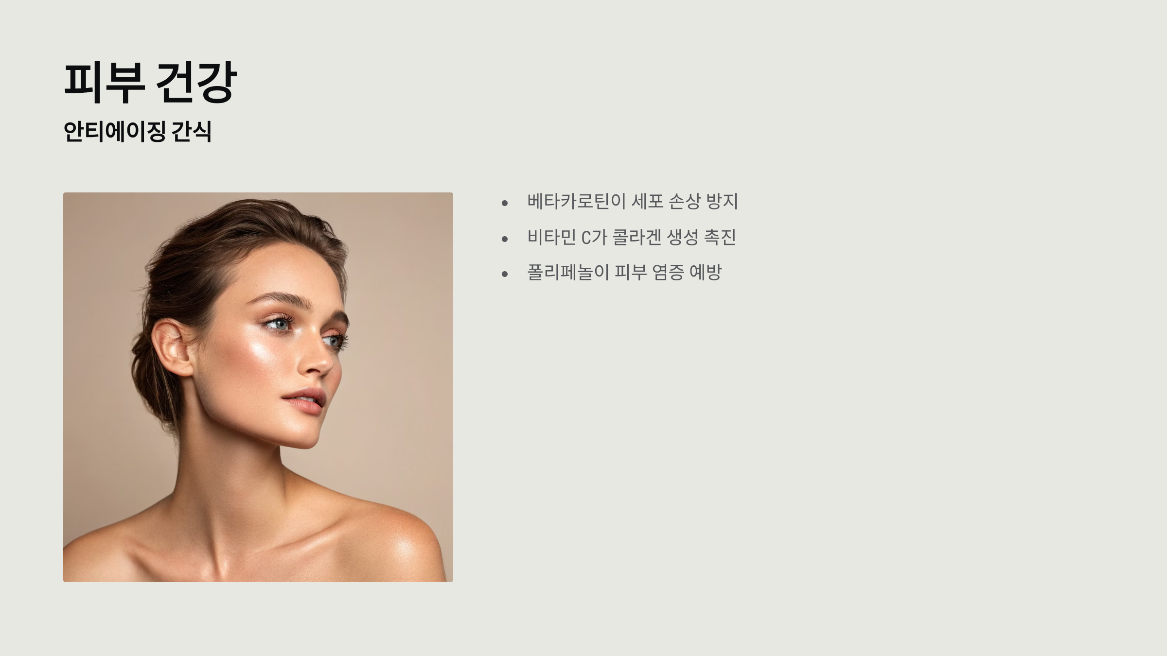 - 베타카로틴: 체내에서 비타민 A로 전환되어 세포 산화 억제
