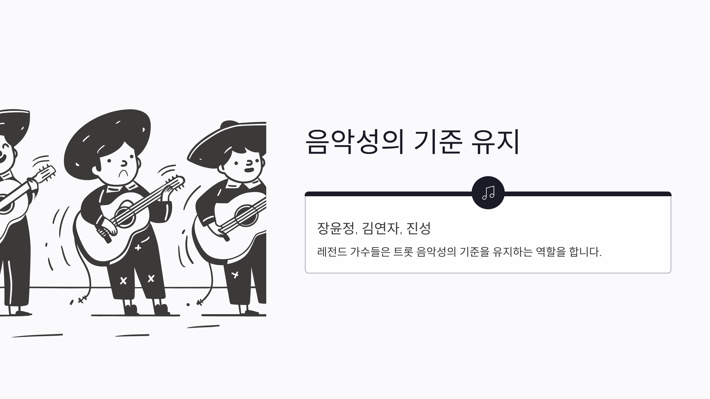 장윤정, 김연자, 진성 등 레전드 가수들은 트롯 음악성의 기준을 유지하는 역할을 합니다.