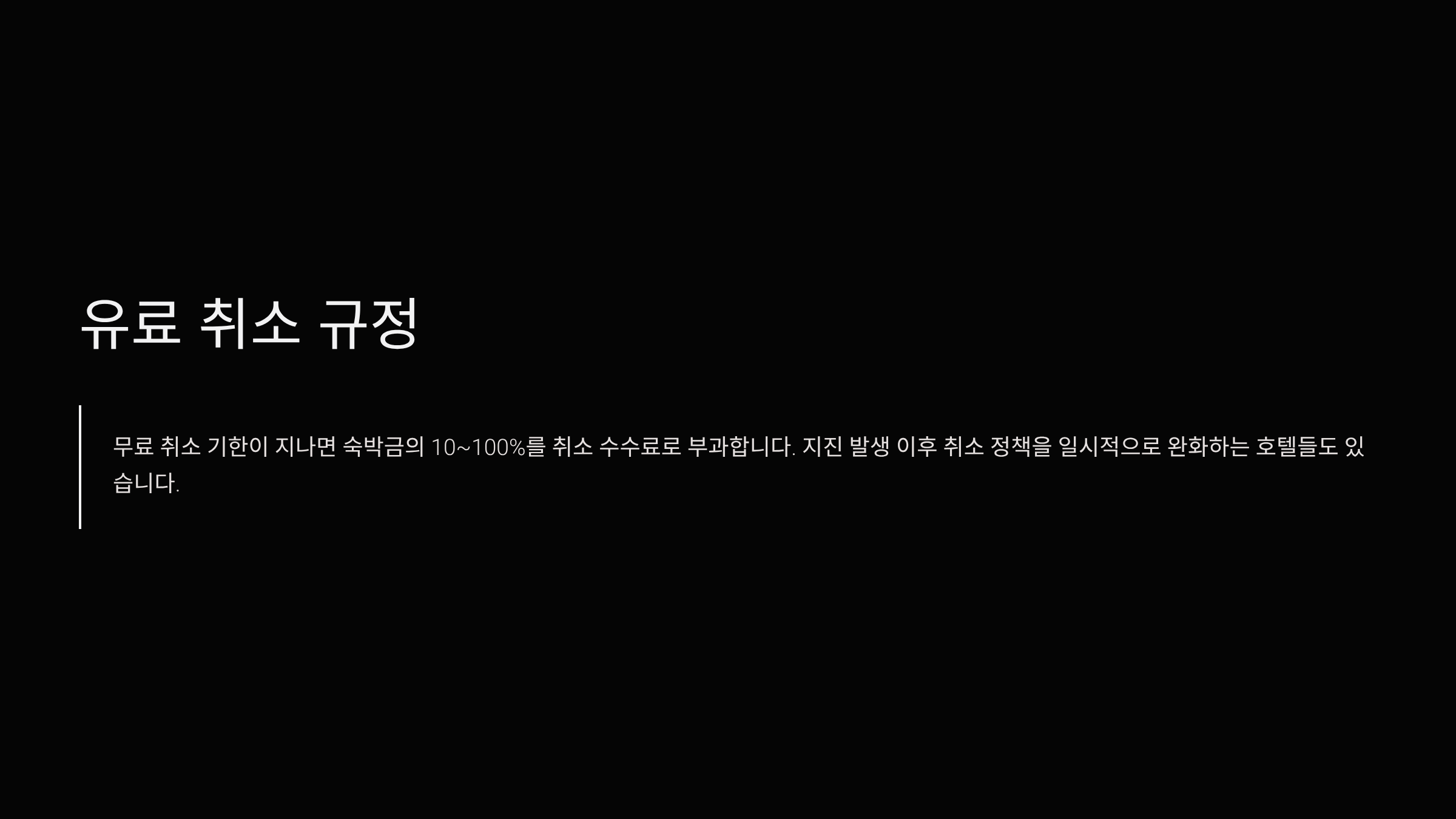- 무료 취소 기한이 지나면 숙박금의 10~100%를 취소 수수료로 부과합니다