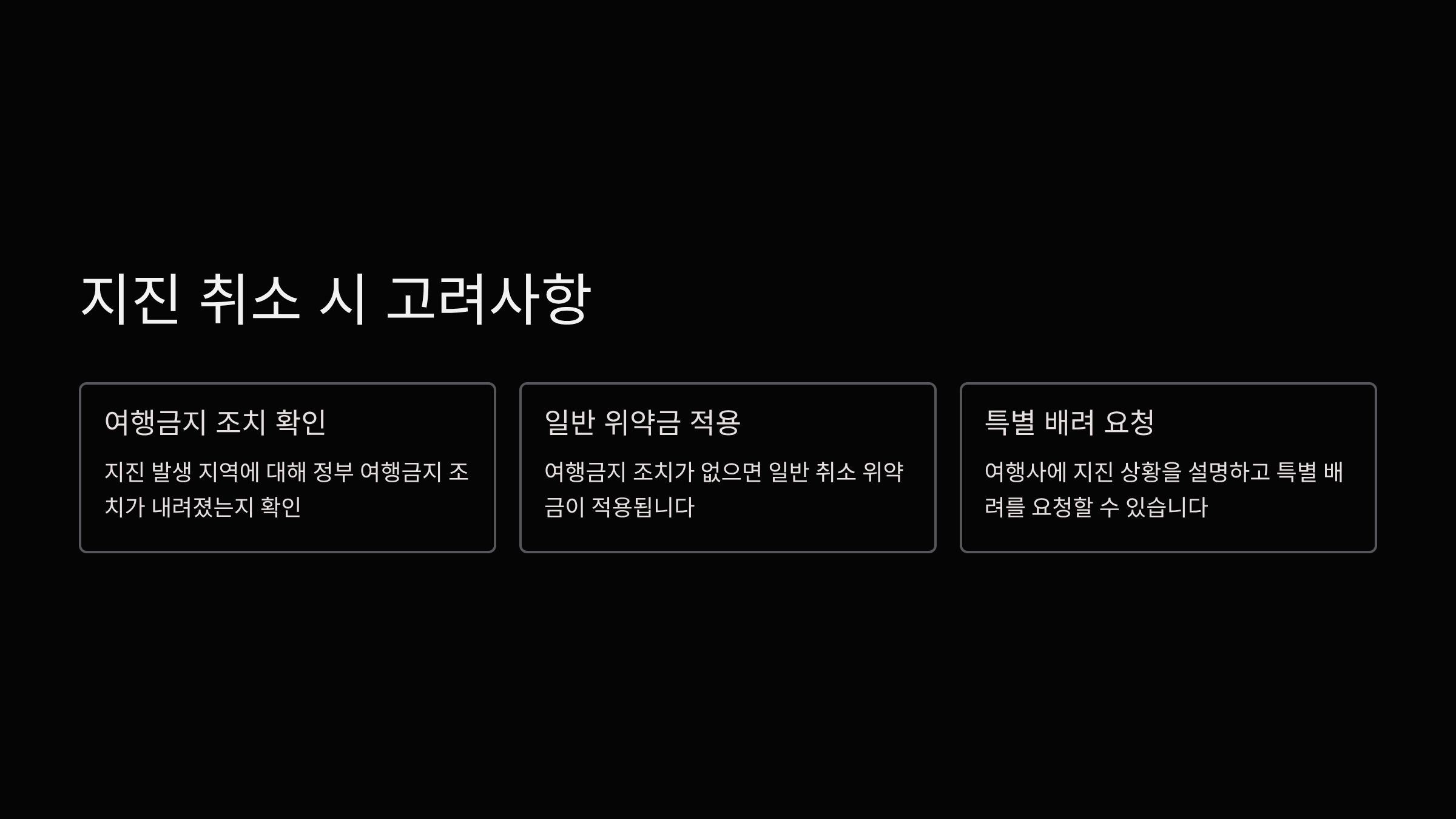 - 지진 발생 지역이 여행 일정에 직접 포함되어 있거나, 정부의 여행금지 조치가 내려진 경우: 수수료 면제 환불이 가능할 수 있습니다