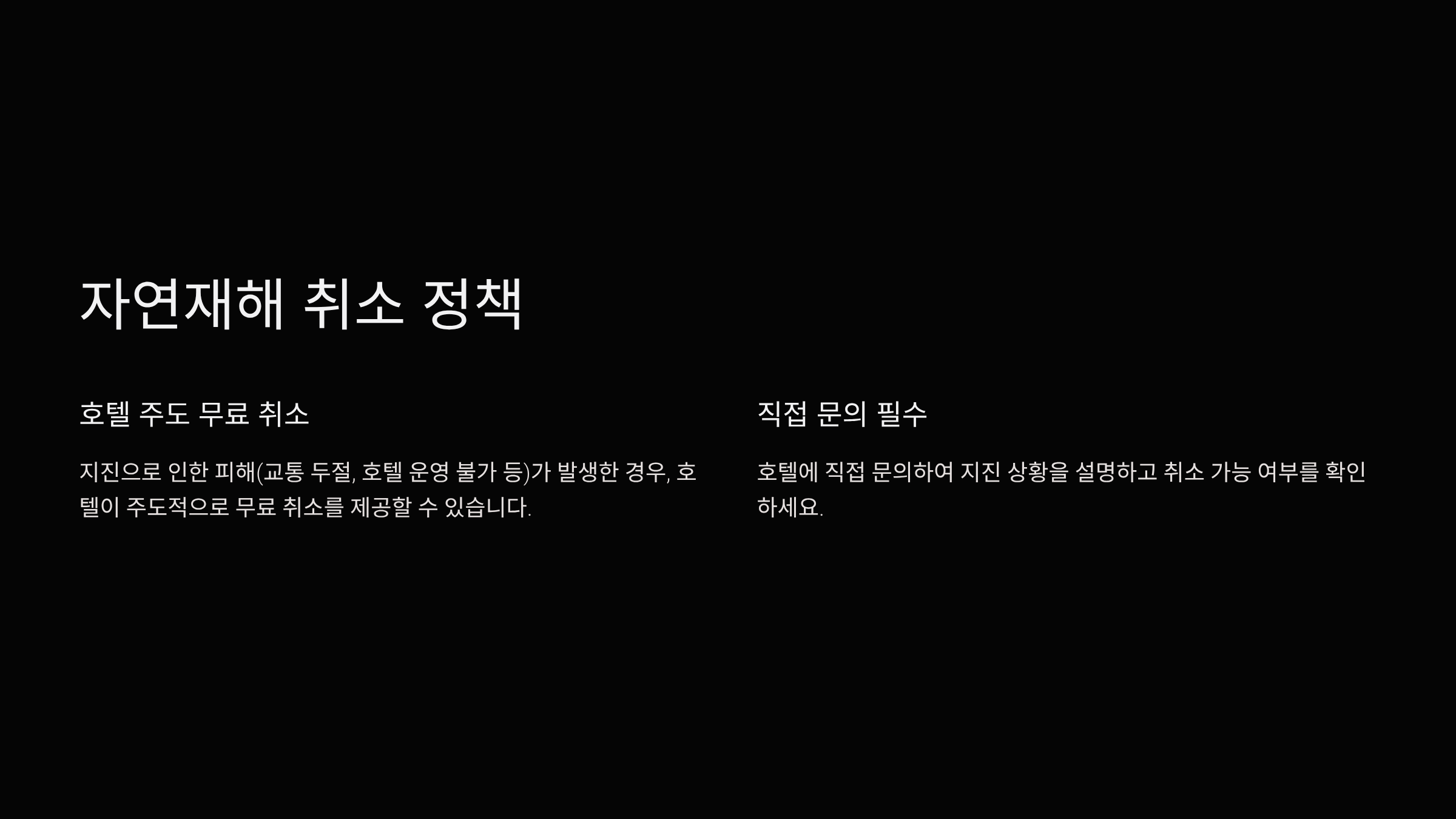 - 지진으로 인한 피해(교통 두절, 호텔 운영 불가 등)가 발생한 경우, 호텔이 주도적으로 무료 취소를 제공할 수 있습니다