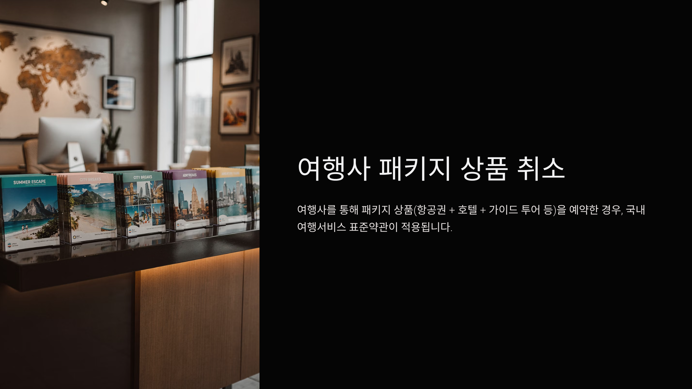 여행사를 통해 패키지 상품(항공권 + 호텔 + 가이드 투어 등)을 예약한 경우, 국내 여행서비스 표준약관이 적용됩니다.