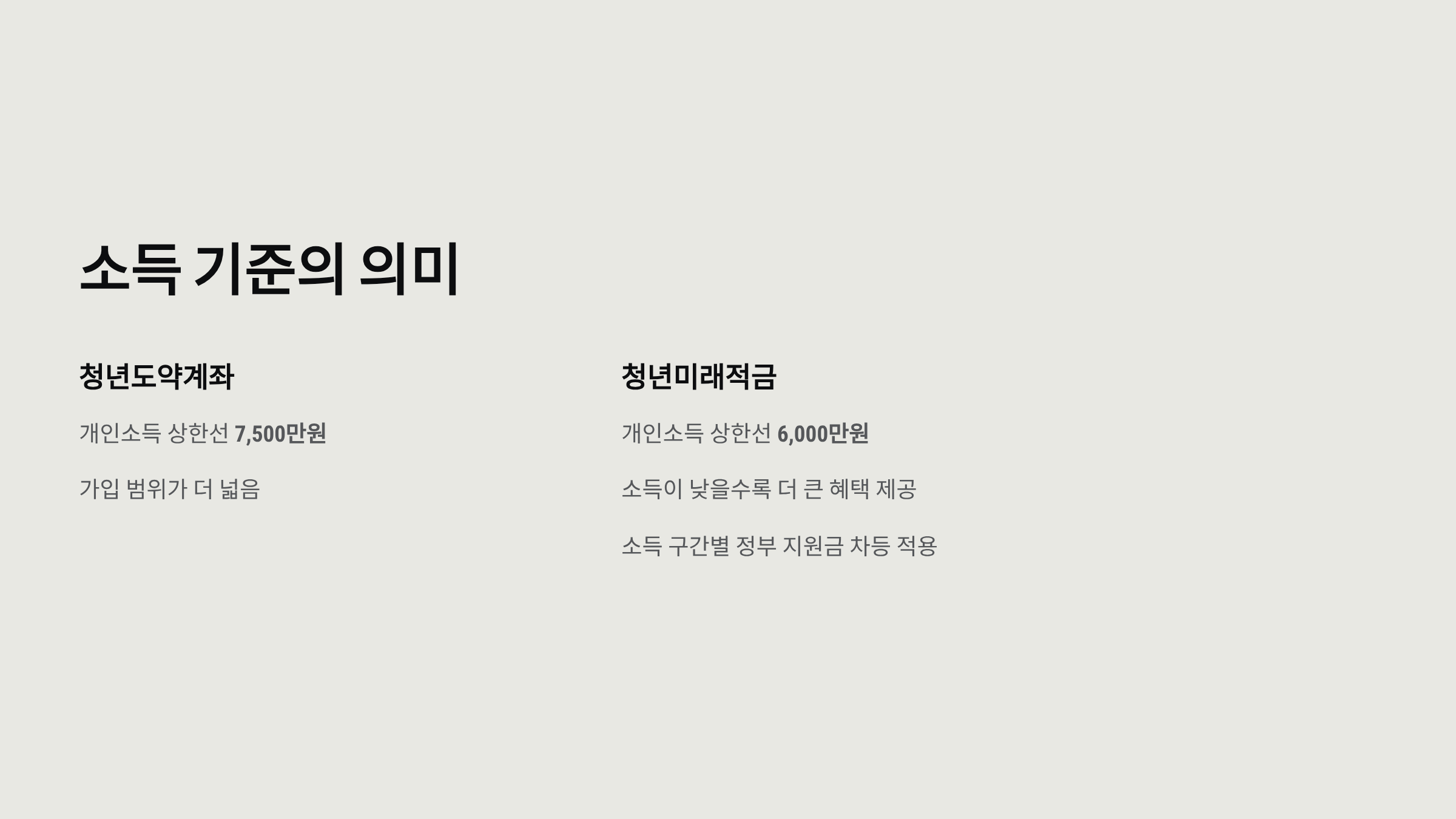청년도약계좌의 개인소득 상한선은 7,500만원이었습니다. 청년미래적금은 6,000만원으로 낮춰졌는데, 이는 더 소수의 청년들만 가입할 수 있다는 의미입니다. 대신 소득 구간별 정부 지원금이 차등 적용되므로, 소득이 낮을수록 상대적으로 더 큰 혜택을 받을 수 있습니다.