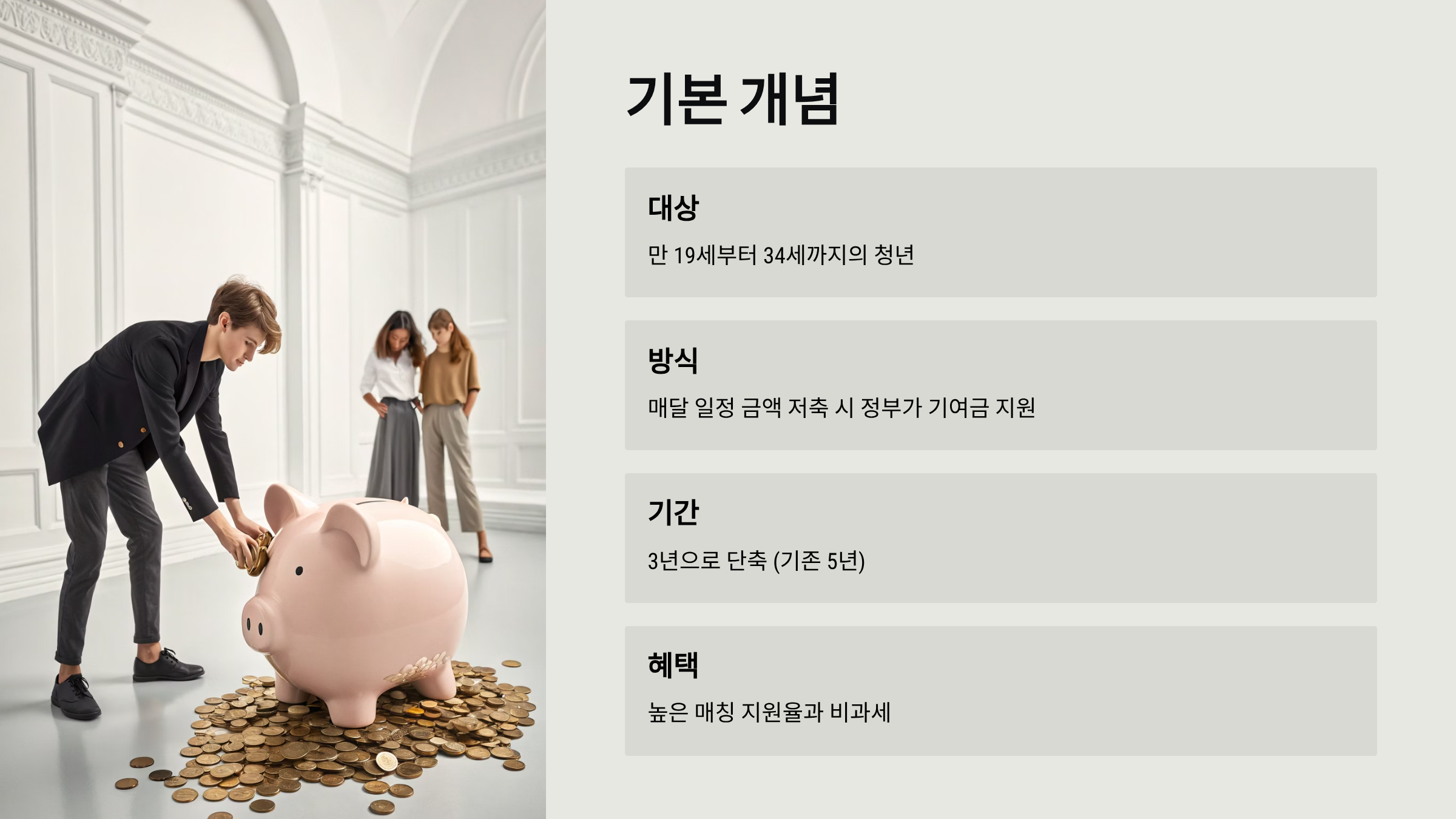 청년미래적금은 만 19세부터 34세까지의 청년이 매달 일정 금액을 저축하면, 정부가 일정 비율의 기여금을 얹어주는 자산 형성 정책입니다. 기존 청년도약계좌의 중도 해지율 문제를 해결하기 위해 가입 기간을 3년으로 단축하고, 정부의 매칭 지원율을 높인 것이 특징입니다.