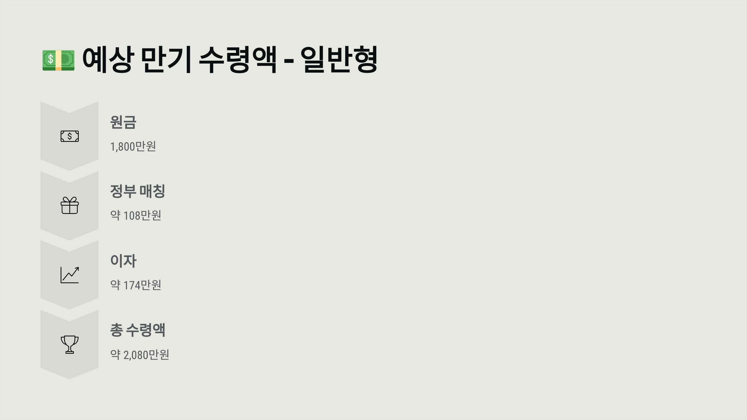 정부 매칭 지원금은 추가로 이자가 붙기 때문에, 최종 수령액은 더 높아집니다.