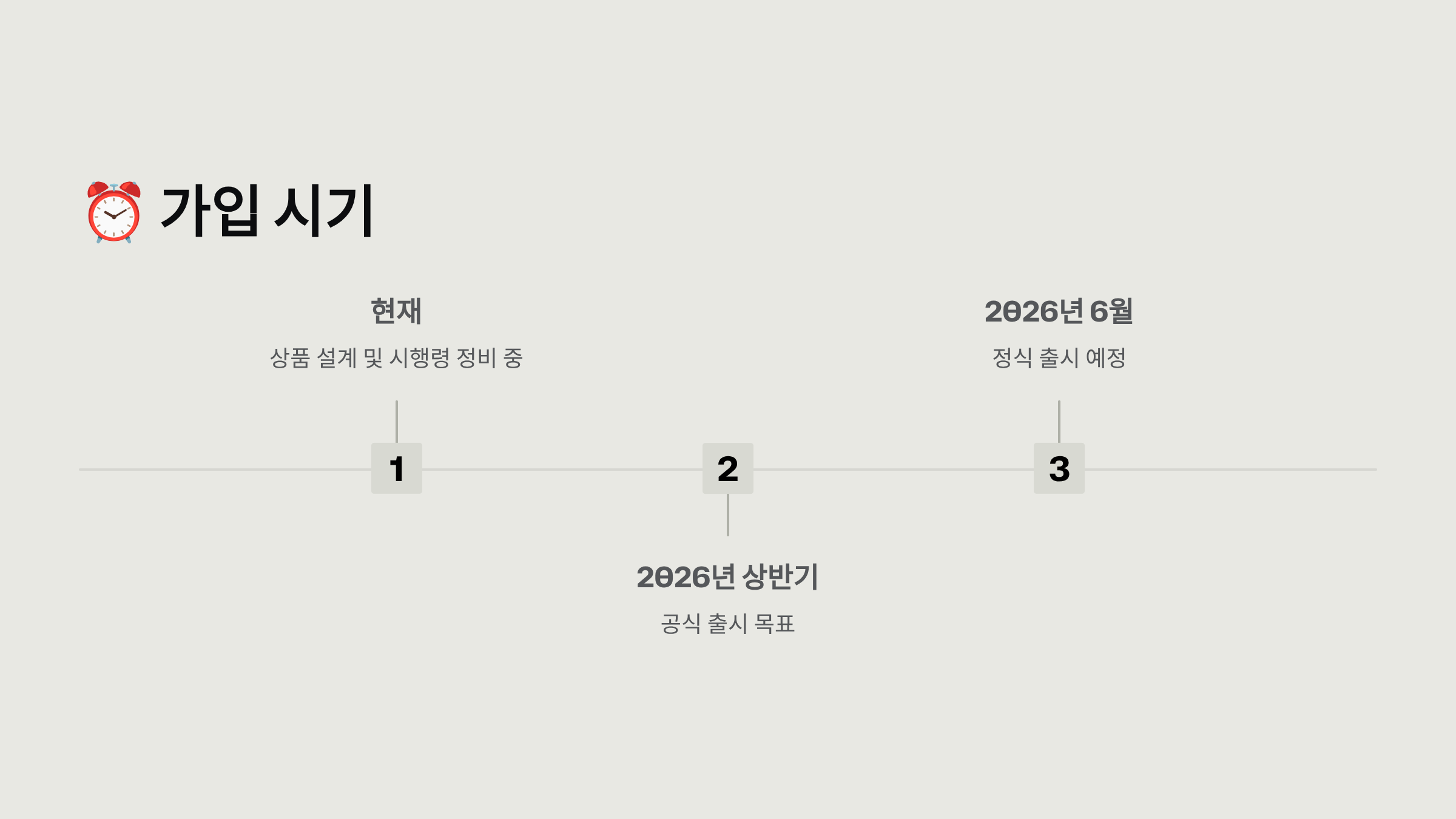 현재 정부는 상품 설계와 시행령 정비를 진행 중이며, 2026년 상반기 공식 출시를 목표로 하고 있습니다.