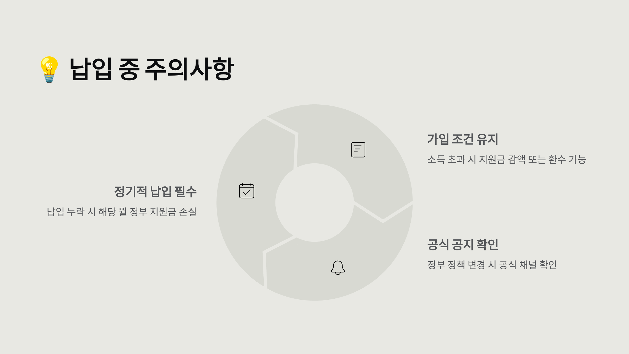 - 납입 누락 시 해당 월의 정부 지원금 손실