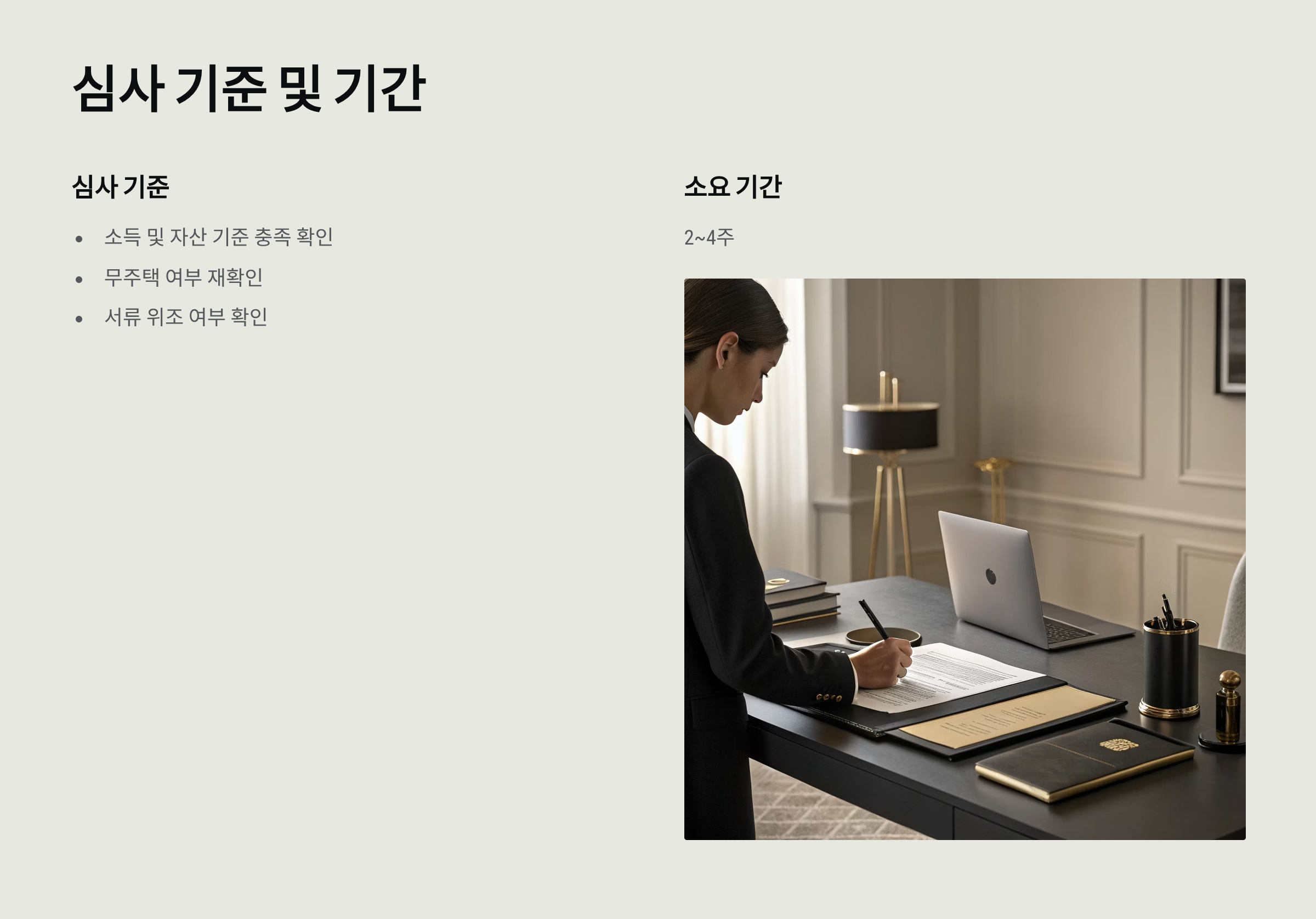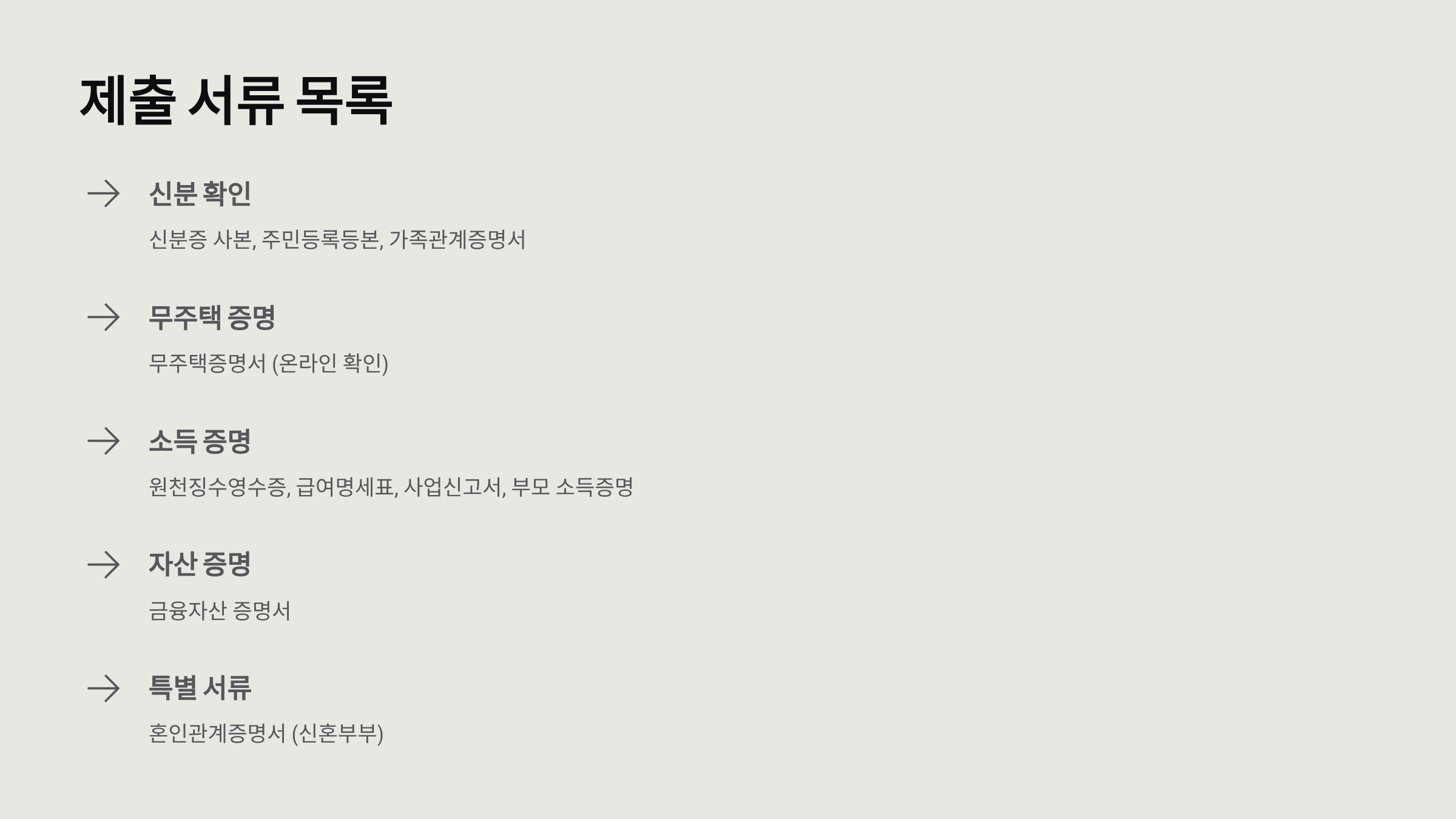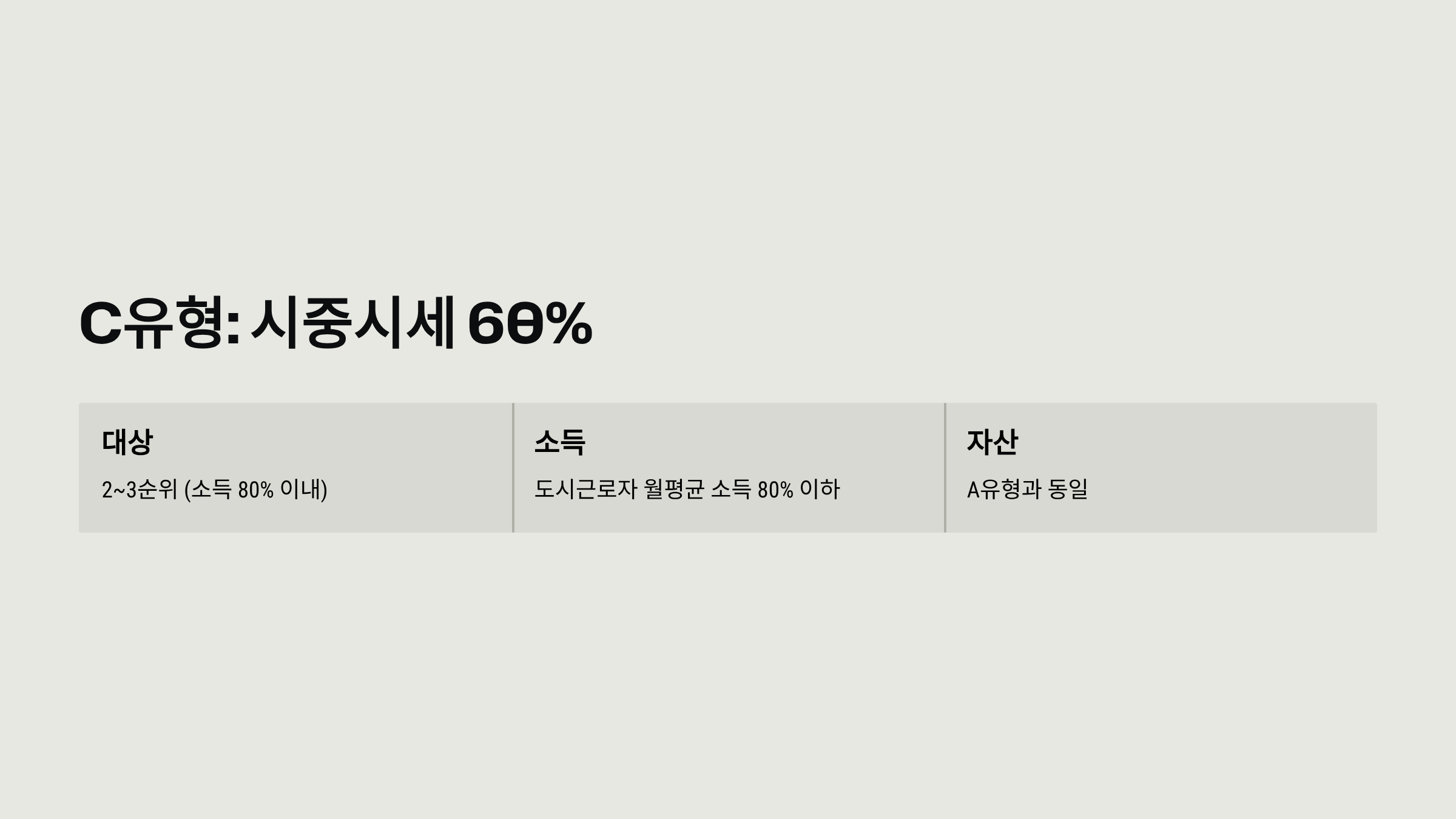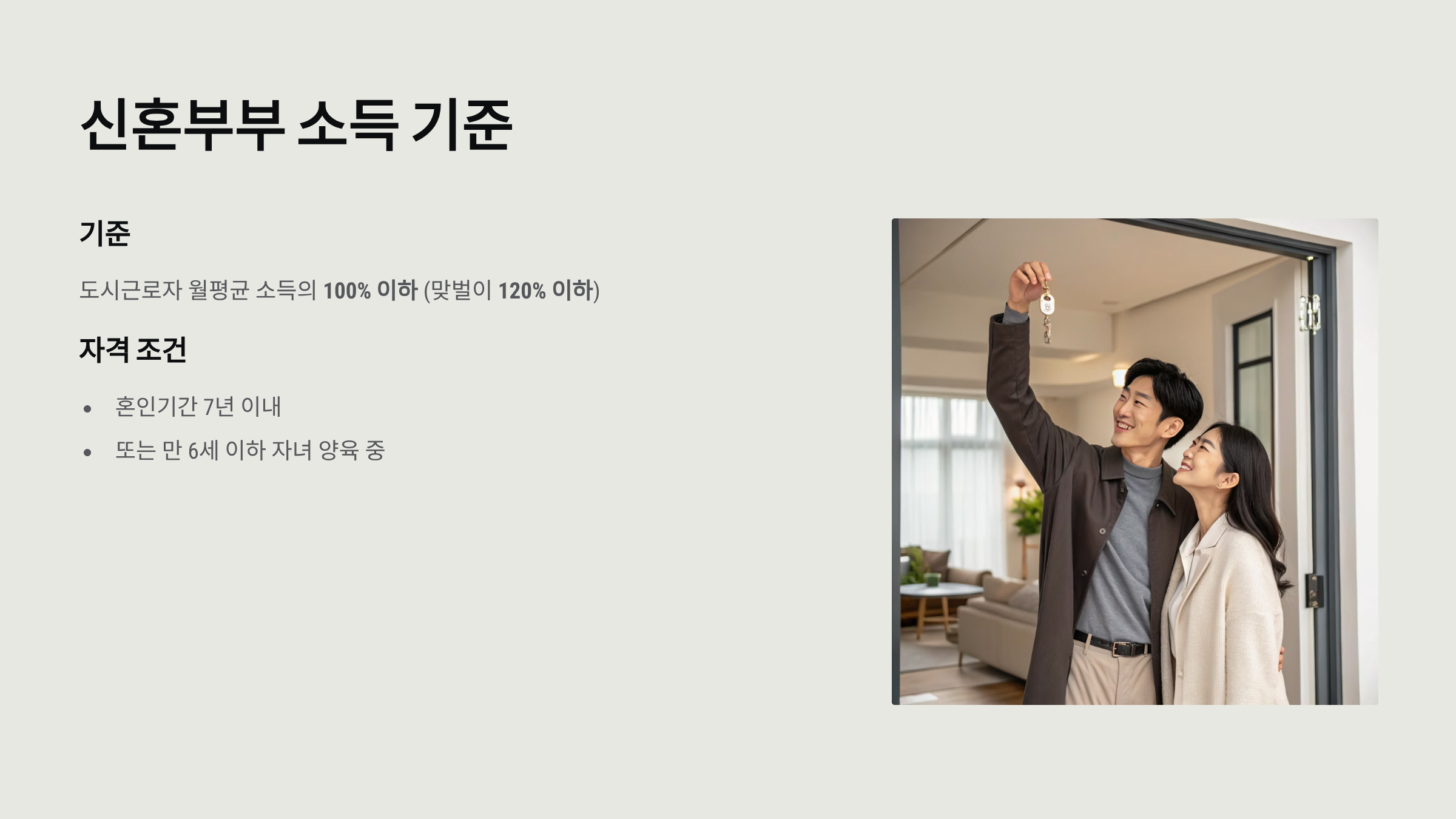 - 기준: 도시근로자 월평균 소득의 100% 이하 (맞벌이 120% 이하)