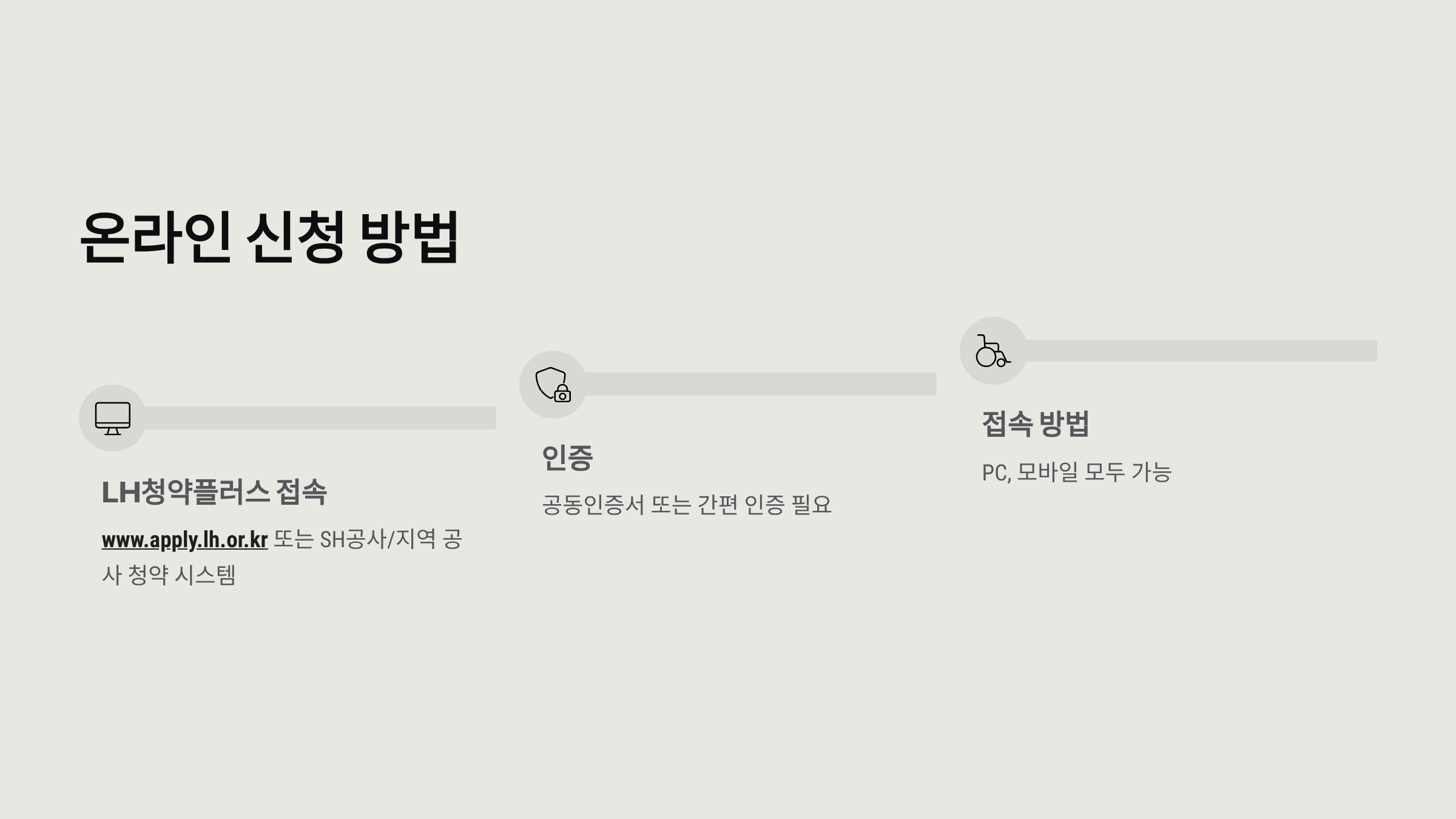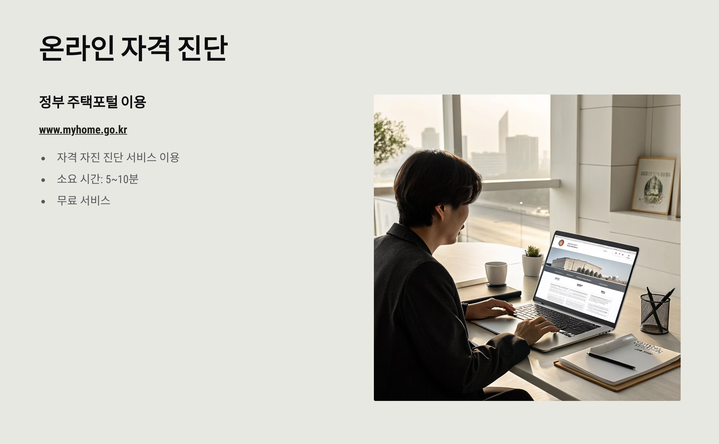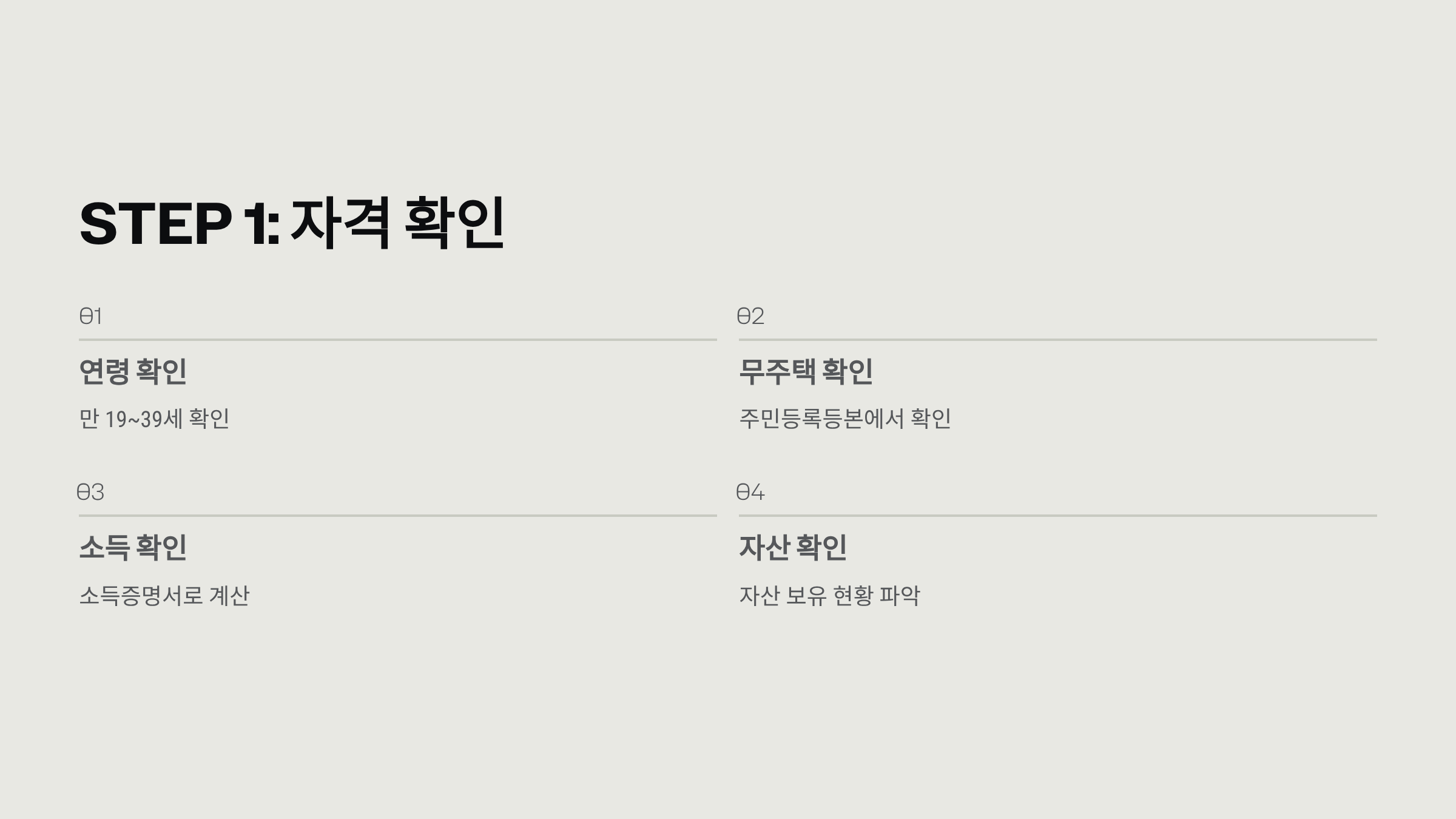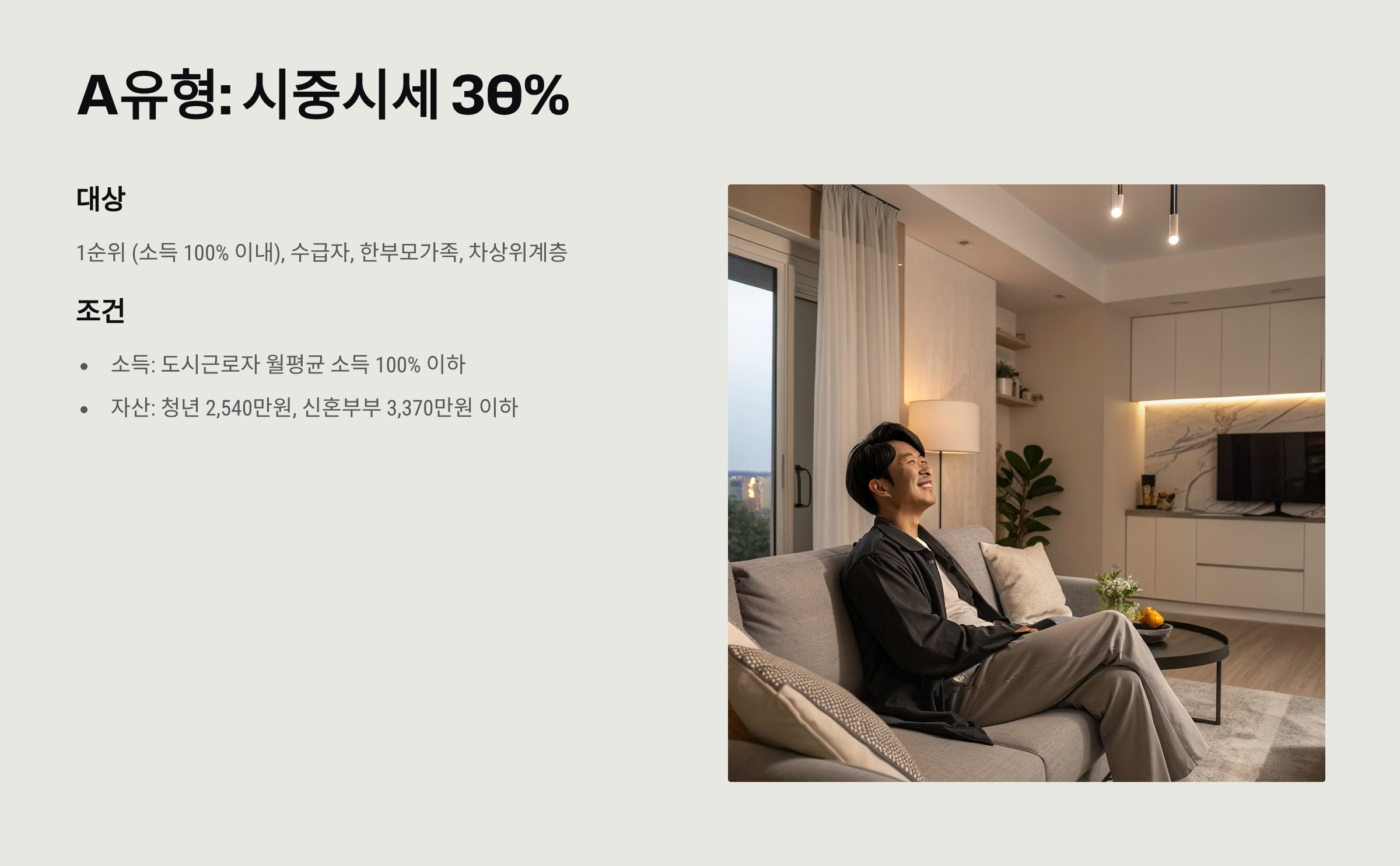 - 기준: 도시근로자 월평균 소득의 100% 이하 (맞벌이 120% 이하)