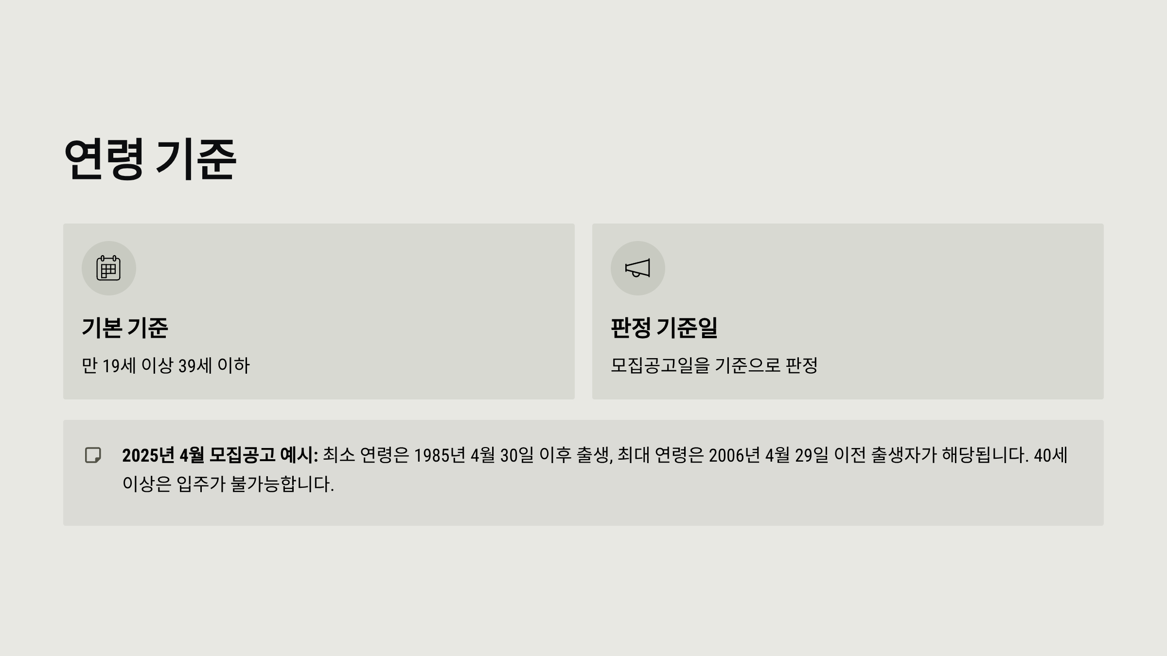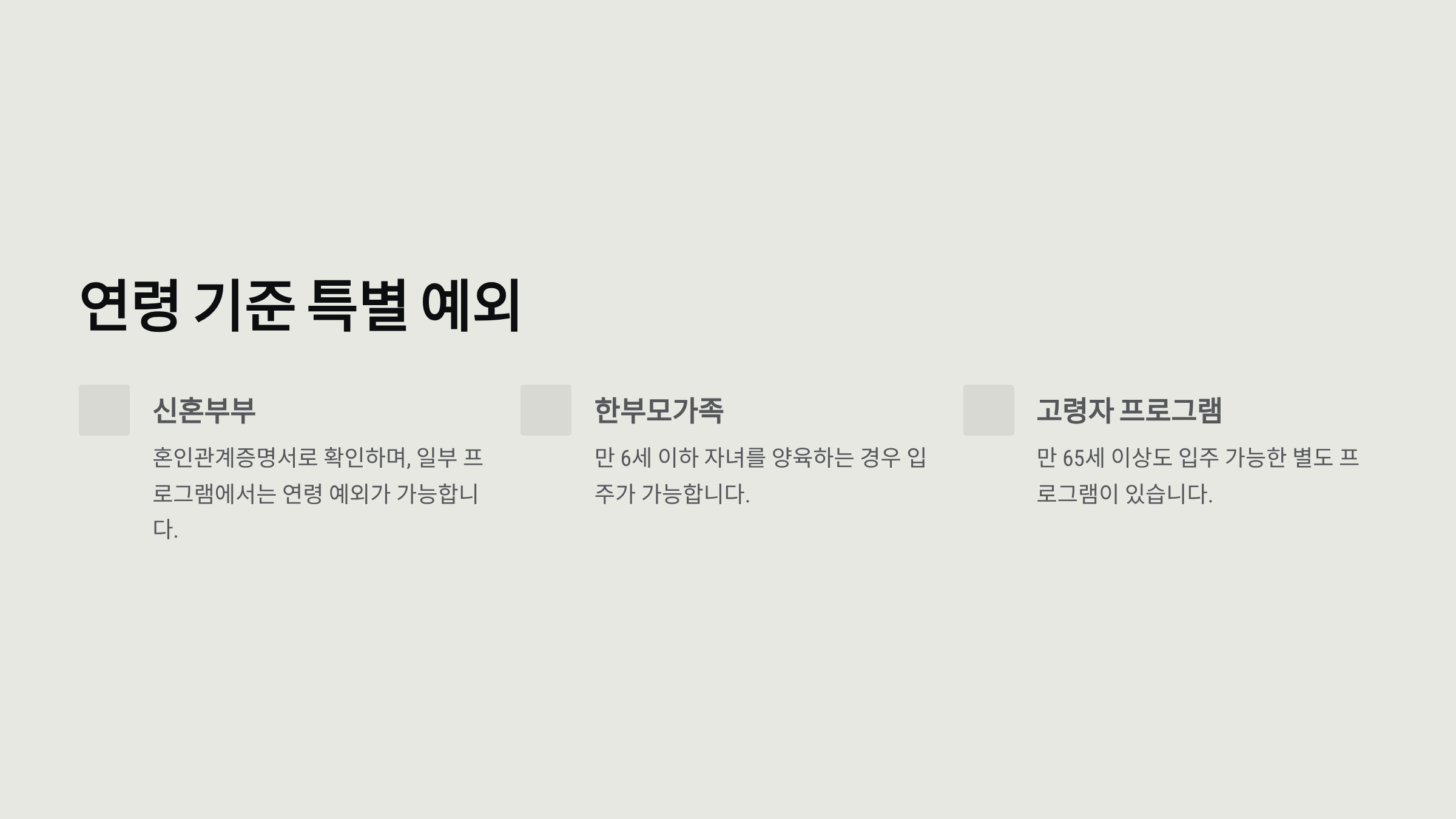 - 고령자 프로그램: 만 65세 이상도 입주 가능한 별도 프로그램 있음