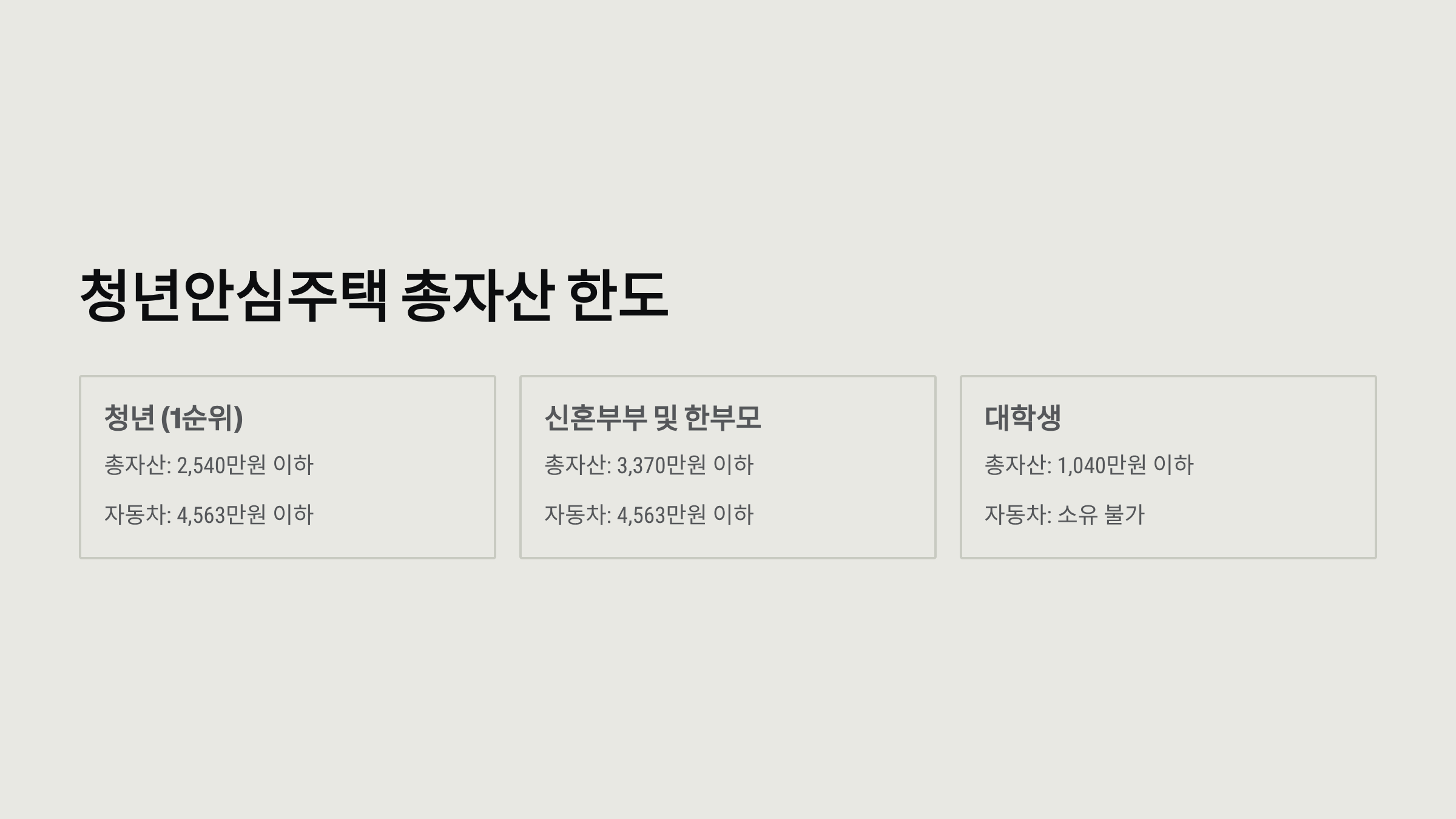- 자산: 청년 2,540만원, 신혼부부 3,370만원 이하