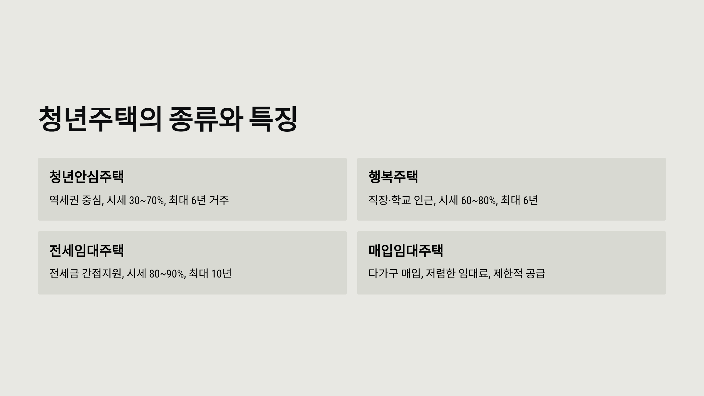 청년주택은 정부가 주도하여 공급하는 공공임대주택으로, 저렴한 임대료로 무주택 청년들의 주거 안정을 지원하는 정책입니다. 2025년 기준으로 청년안심주택(이전 명칭: 역세권 청년주택), 행복주택, 전세임대주택, 매입임대주택 등 다양한 유형이 있으며, 각각 다른 입주 조건과 혜택을 제공합니다. 이 글에서는 청년주택 입주에 필요한 모든 조건을 상세히 정리해드리겠습니다.