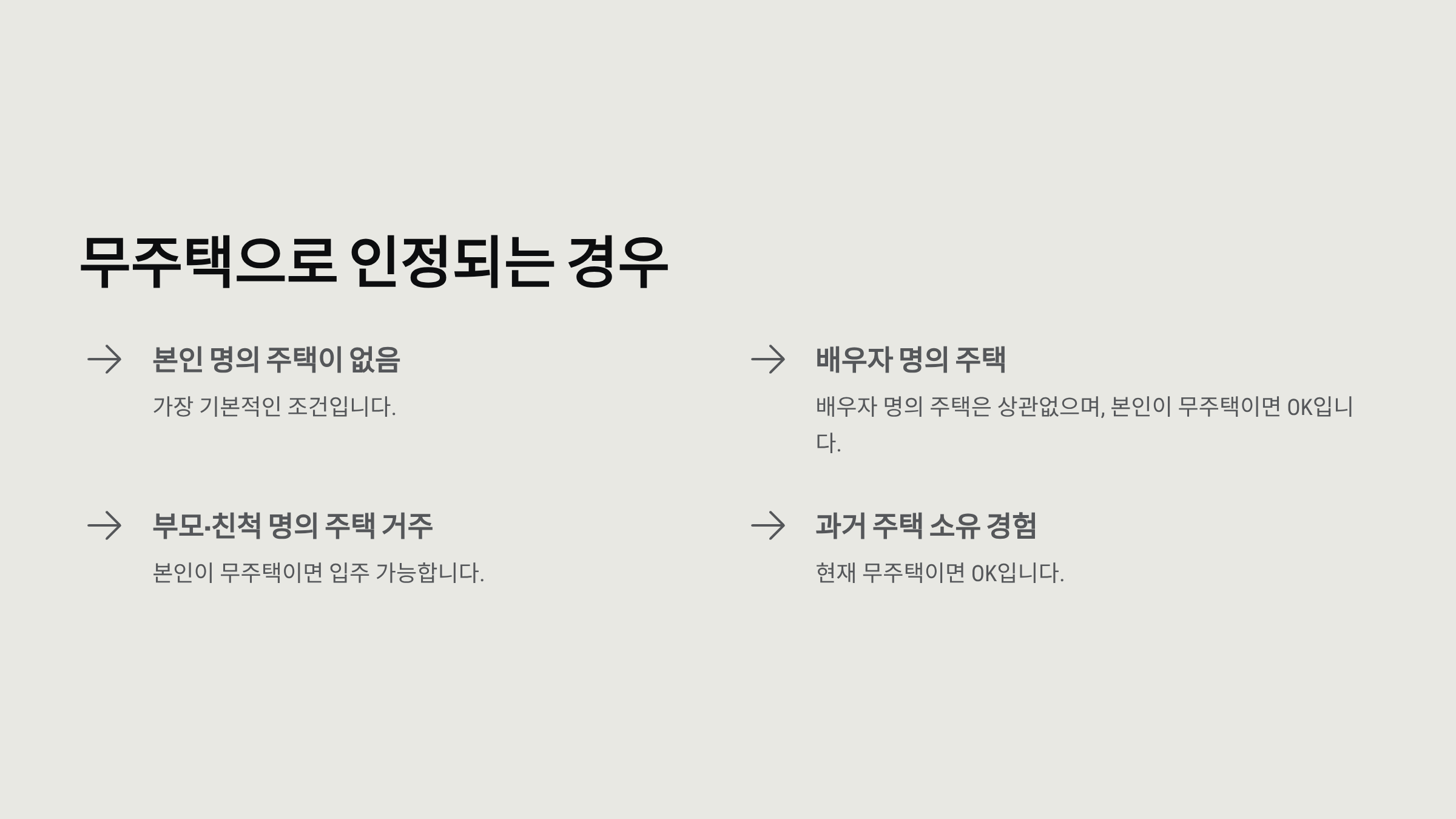 - 배우자 명의 주택은 상관없음 (본인이 무주택이면 OK)