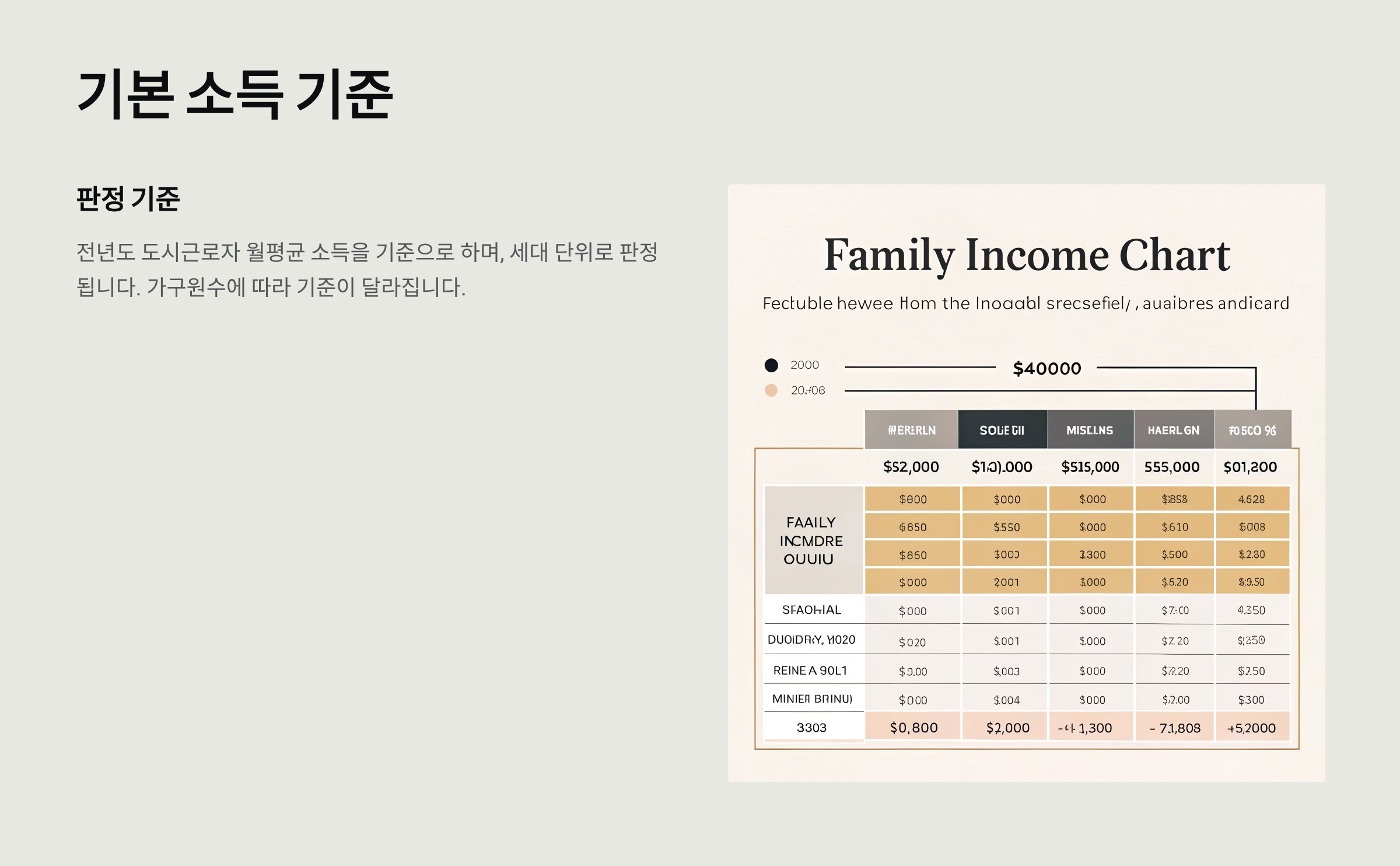- 기준: 도시근로자 가구원수별 월평균 소득의 100% 이하
