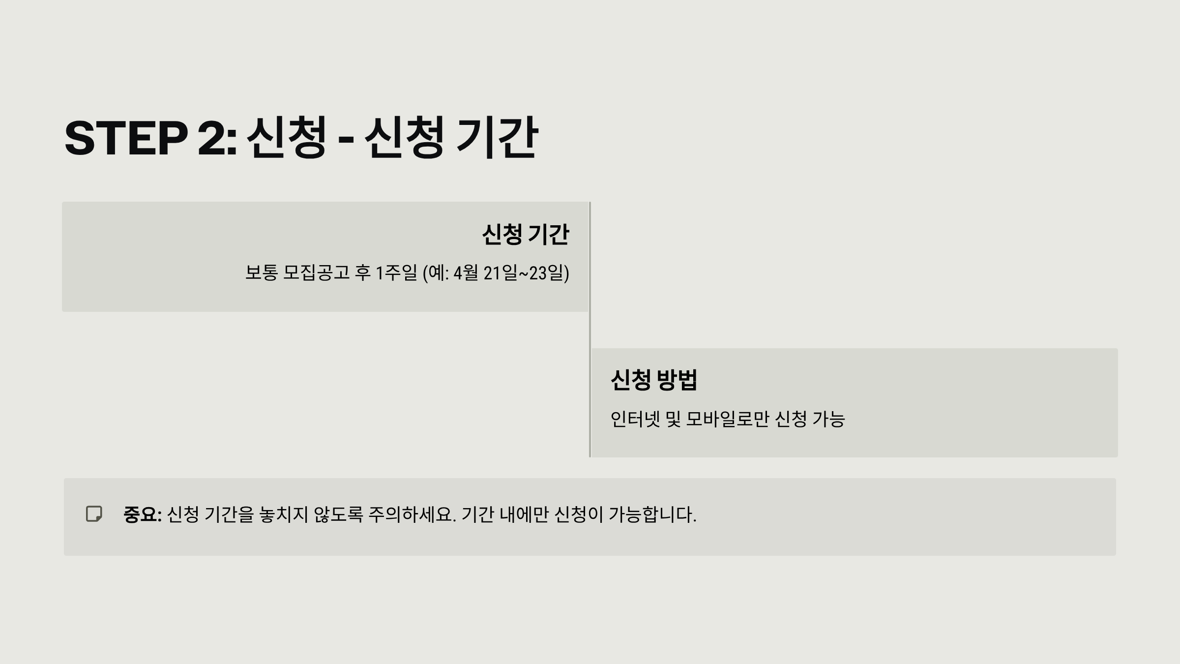 - 보통 모집공고 후 1주일 (예: 4월 21일~23일)