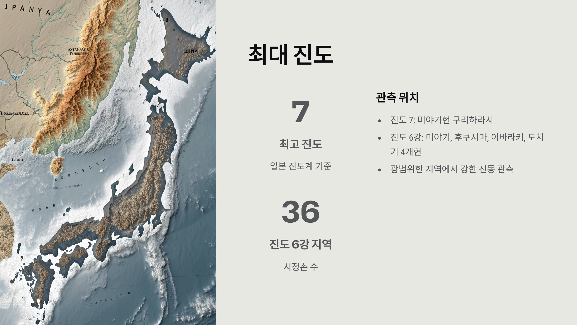 - 최고 진도: 진도 7 (일본 진도계 기준)