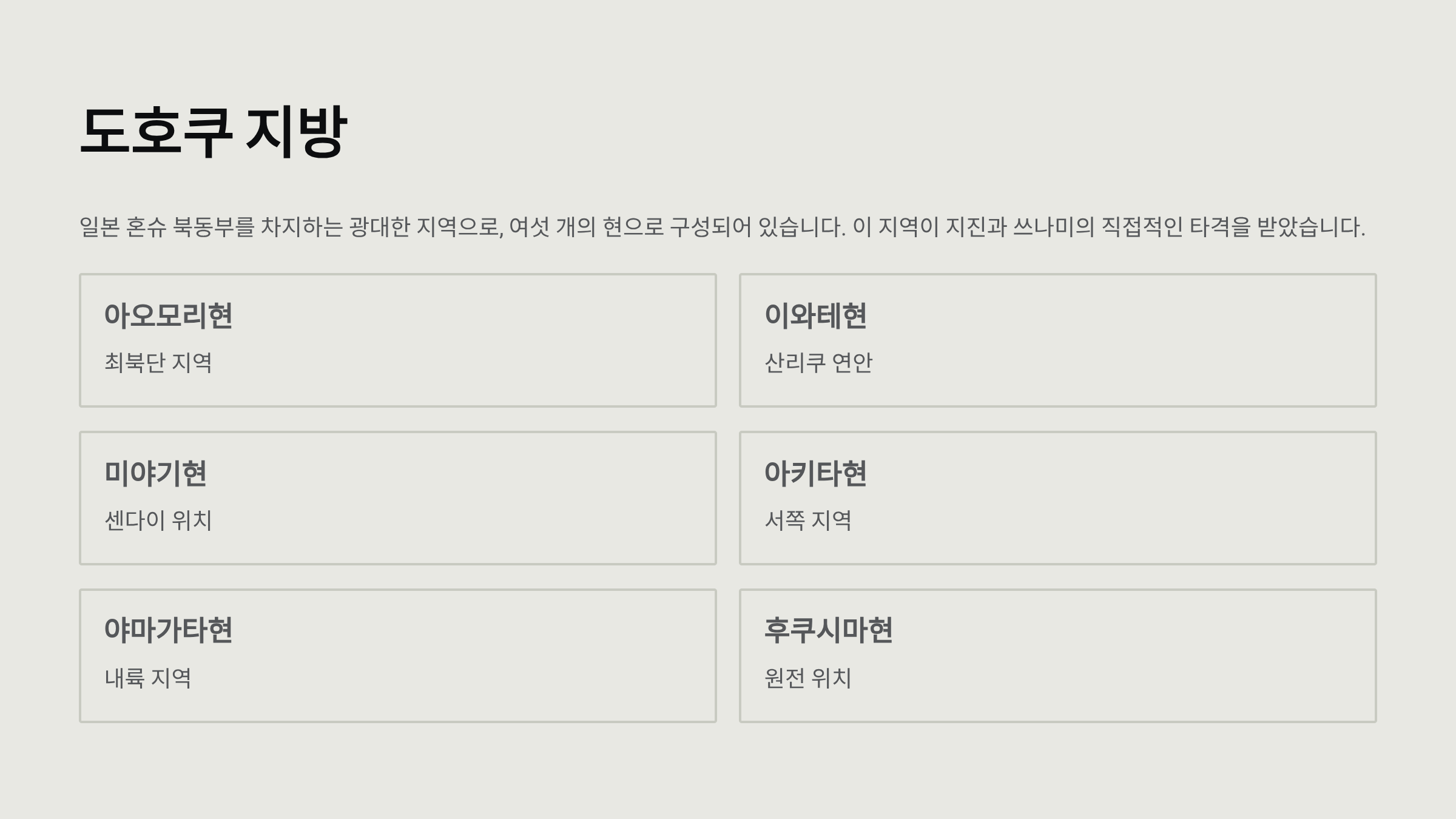 도호쿠 지방은 일본 혼슈 북동부를 차지하는 광대한 지역으로, 여섯 개의 현으로 구성되어 있습니다.