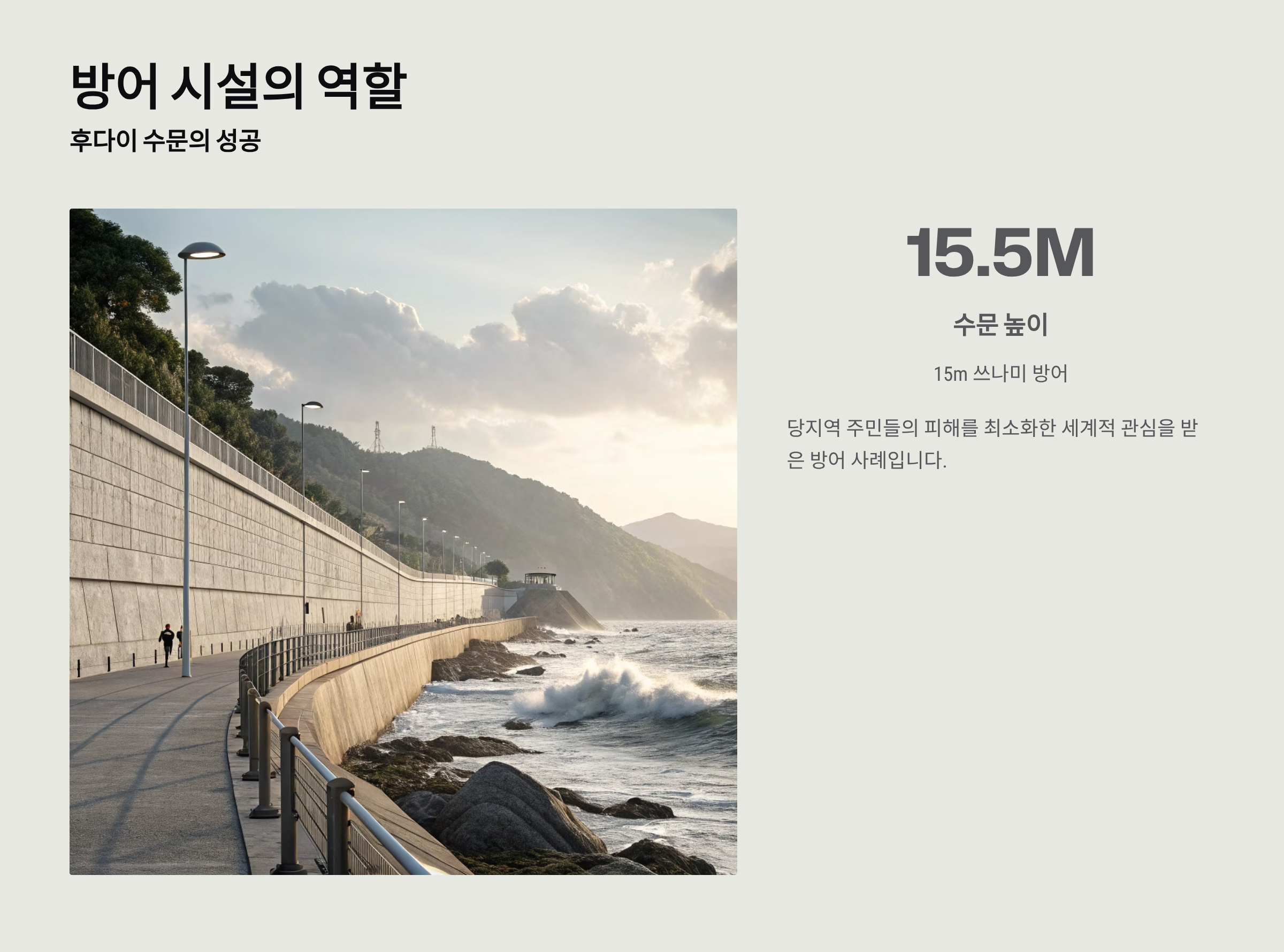 - 높이 15.5m의 수문으로 15m 쓰나미 방어