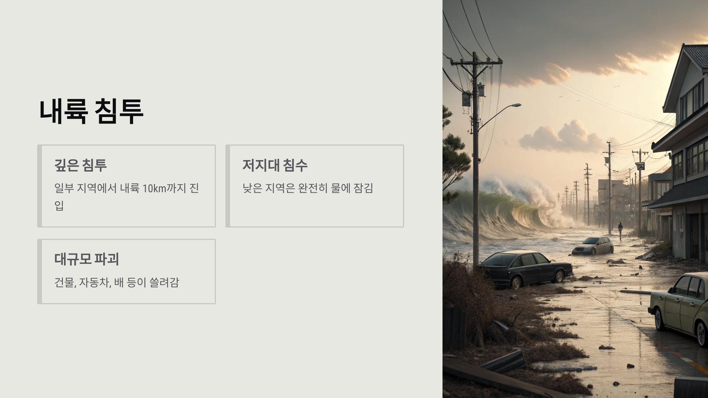 - 건물, 자동차, 배 등이 쓸려가는 피해 발생