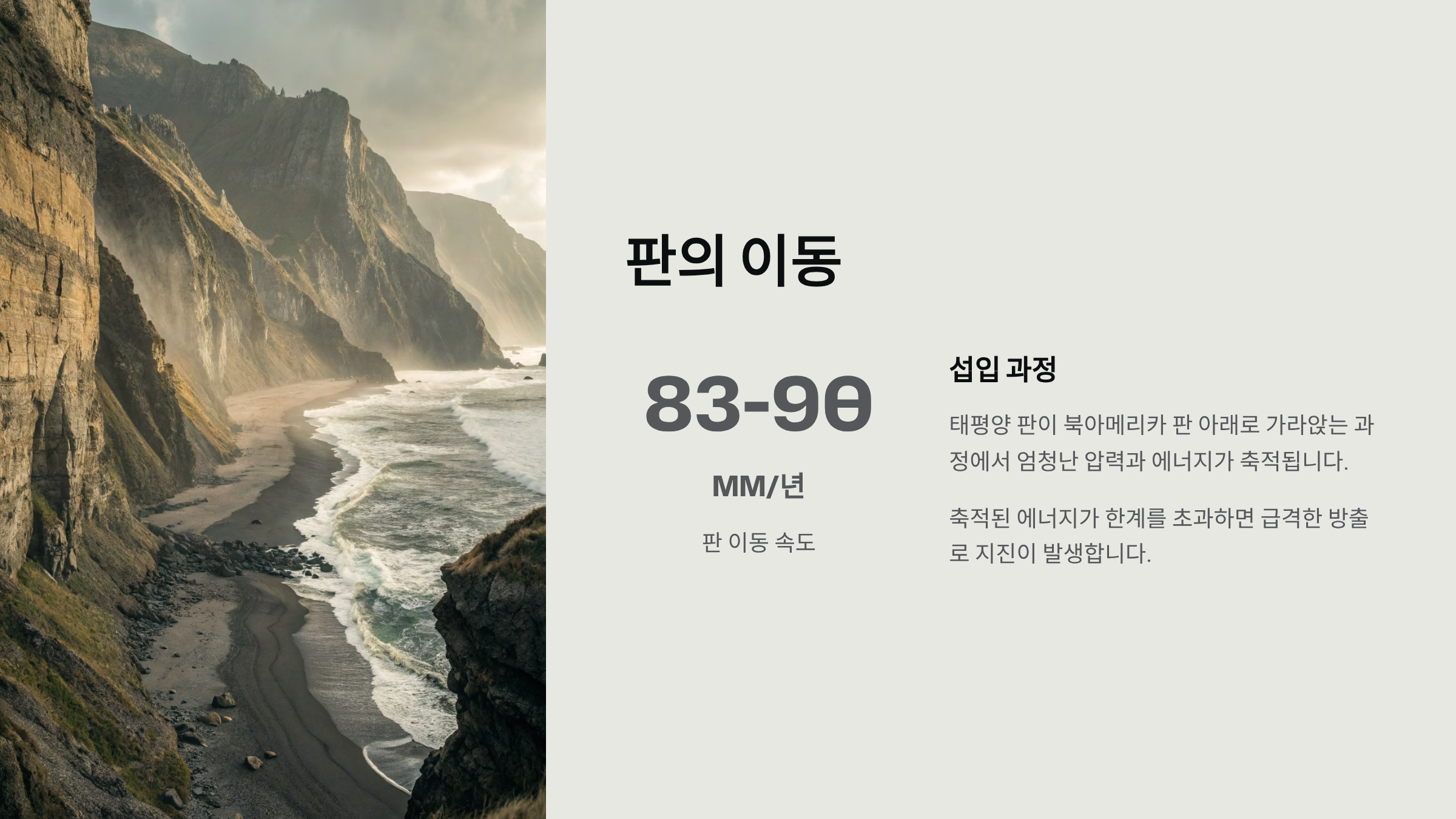 - 태평양 판은 약 83~90mm/년의 속도로 북아메리카 판 아래로 가라앉음 (섭입)