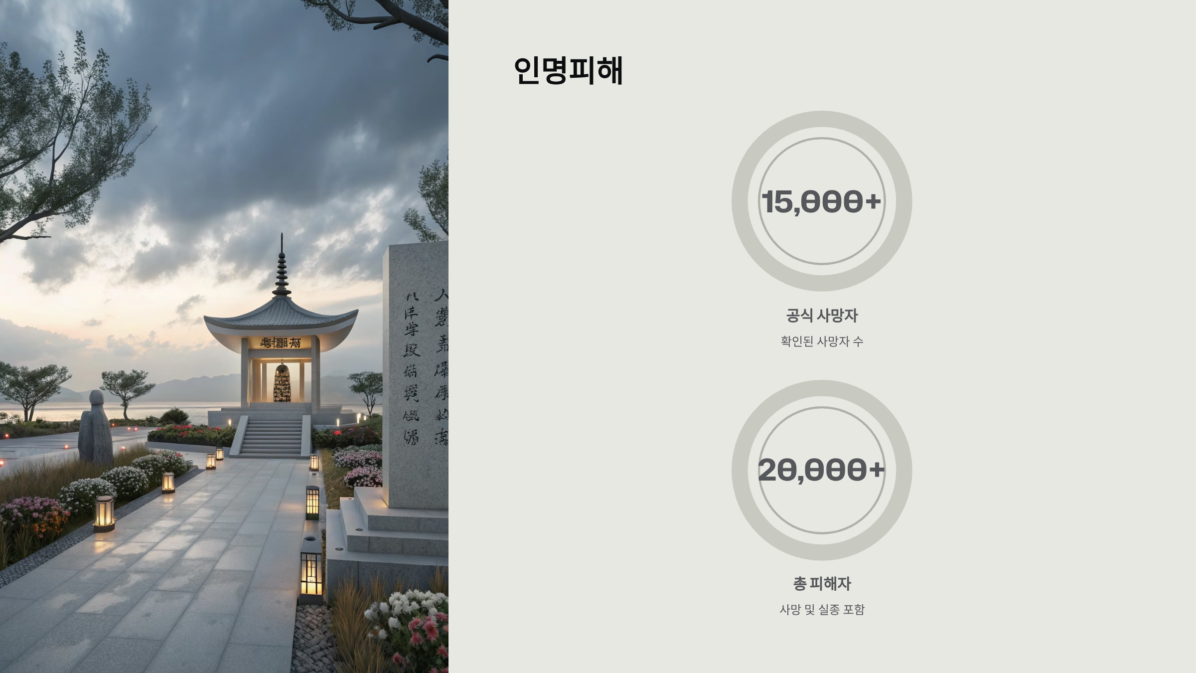 - 실제 사망, 행방불명 포함: 약 20,000명 이상