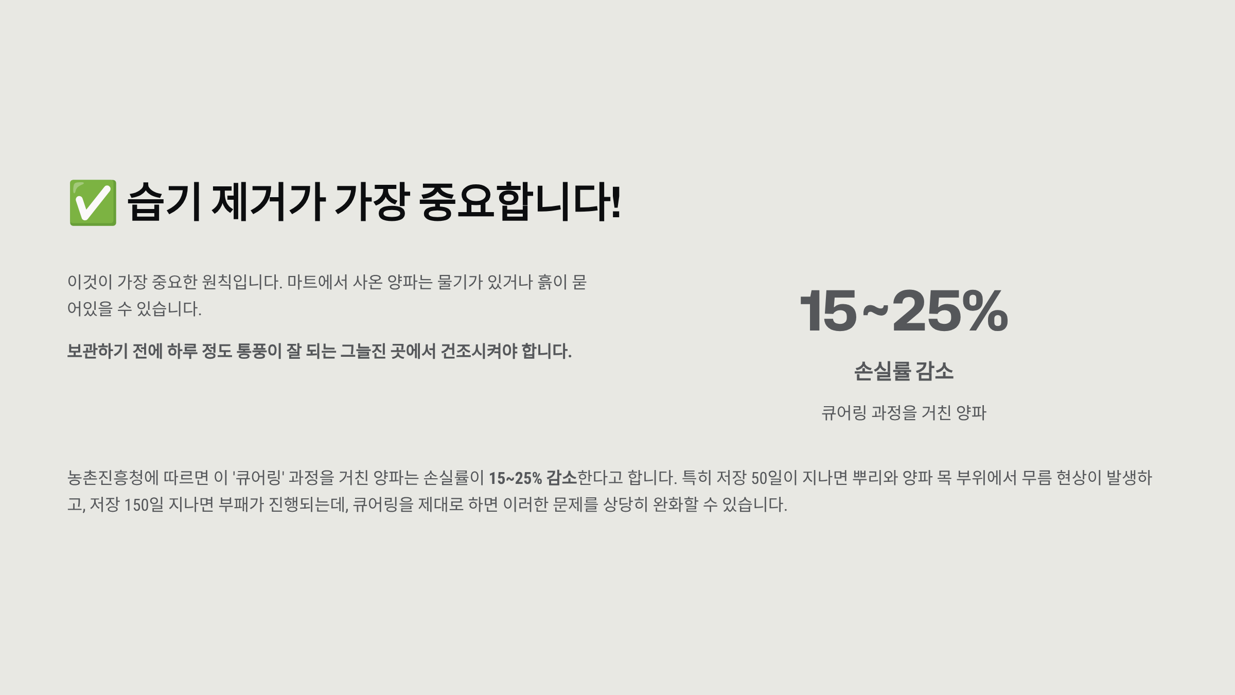 - 올바른 큐어링을 거친 양파: 손실률 15~25% 감소