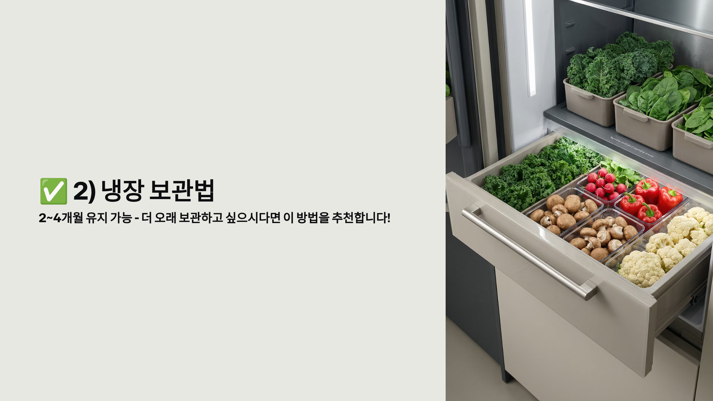 - 🧅 냉장 보관: 더 오래 보관 가능 (2~4개월)