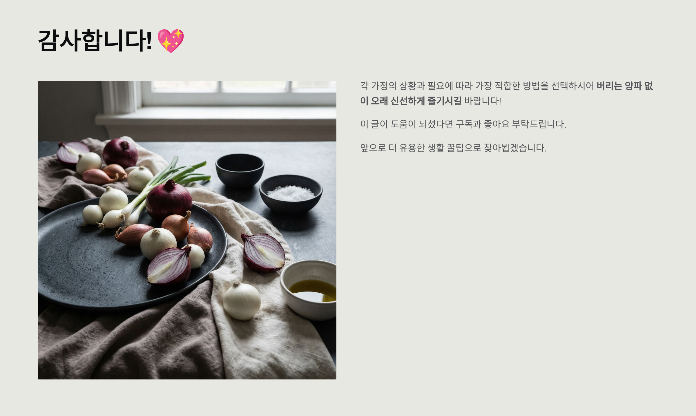 각 가정의 상황과 필요에 따라 가장 적합한 방법을 선택하시어 버리는 양파 없이 오래 신선하게 즐기시길 바랍니다! 이 글이 도움이 되셨다면 구독과 좋아요 부탁드립니다. 앞으로 더 유용한 생활 꿀팁으로 찾아뵙겠습니다. 💖