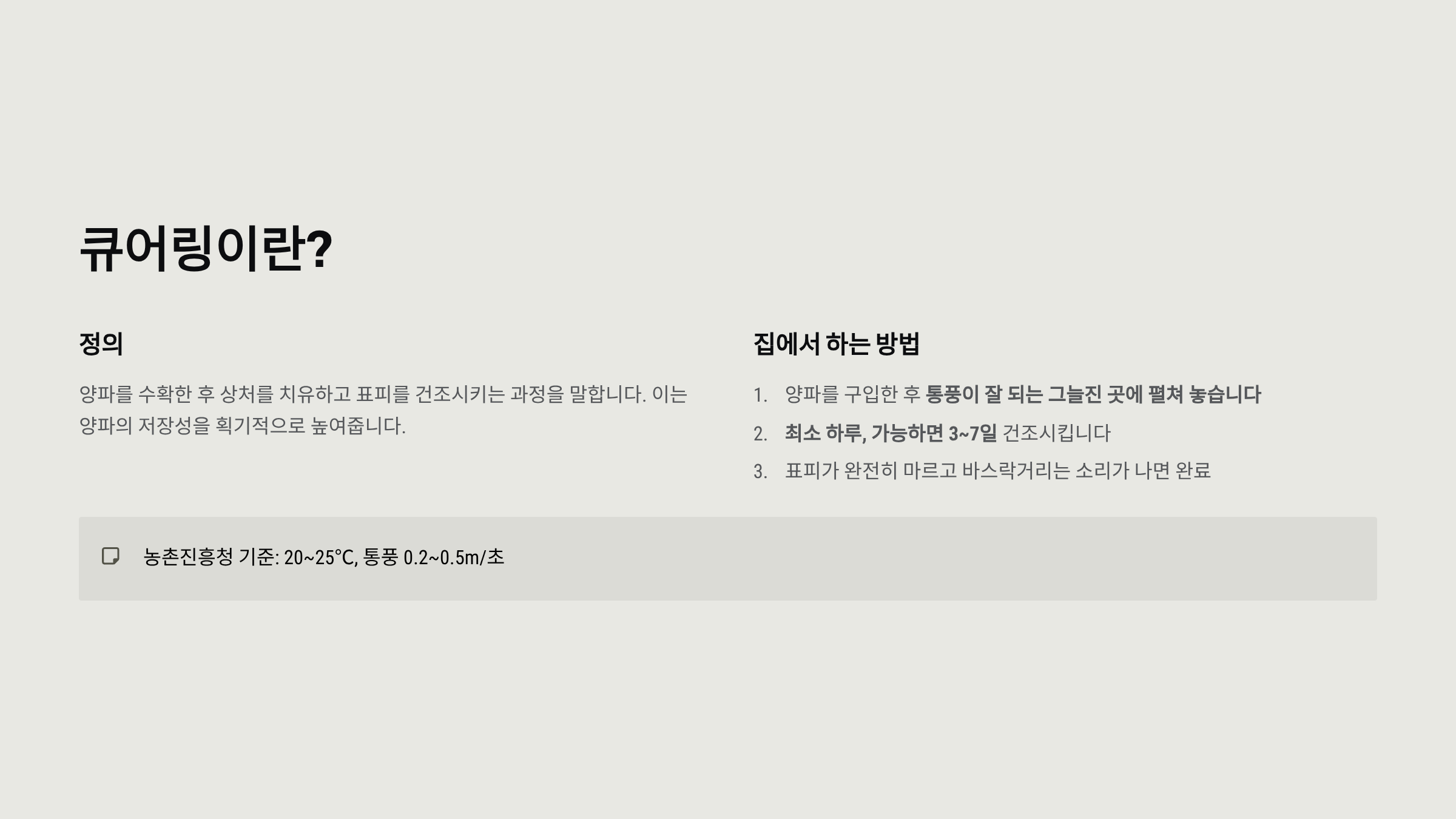 양파를 수확한 후 상처를 치유하고 표피를 건조시키는 과정을 말합니다. 이는 양파의 저장성을 획기적으로 높여줍니다.