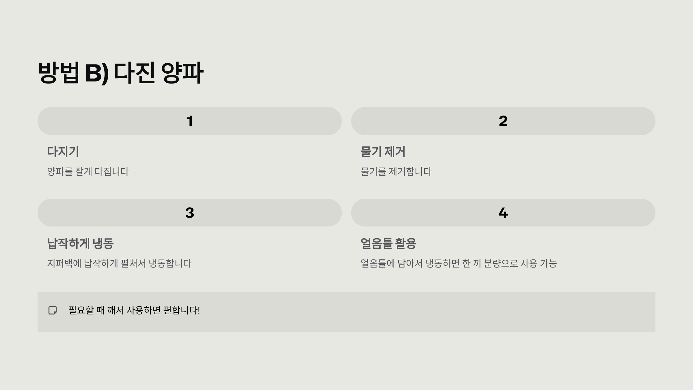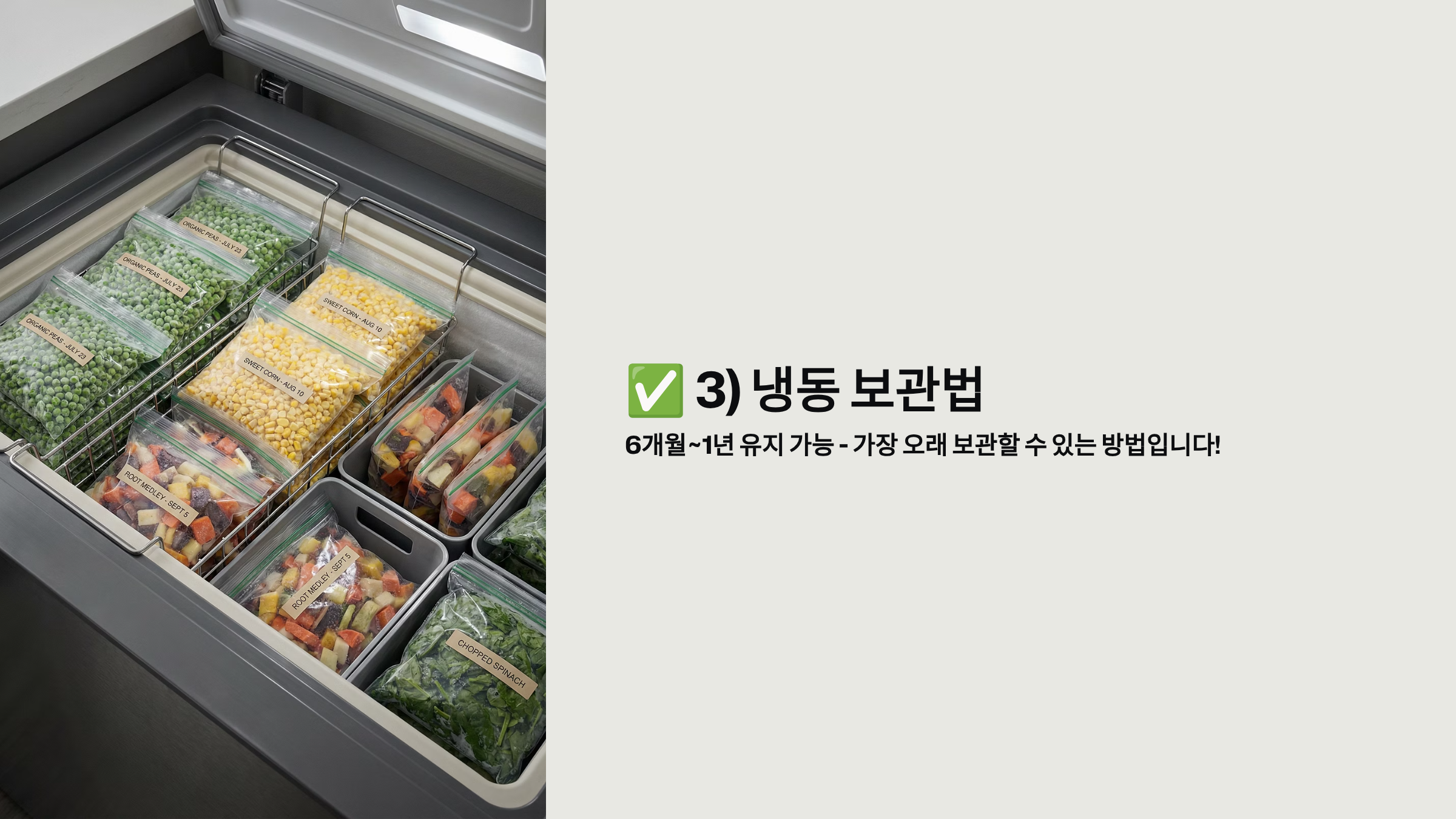 - 🧅 냉동 보관: 가장 오래 보관 (6개월~1년)