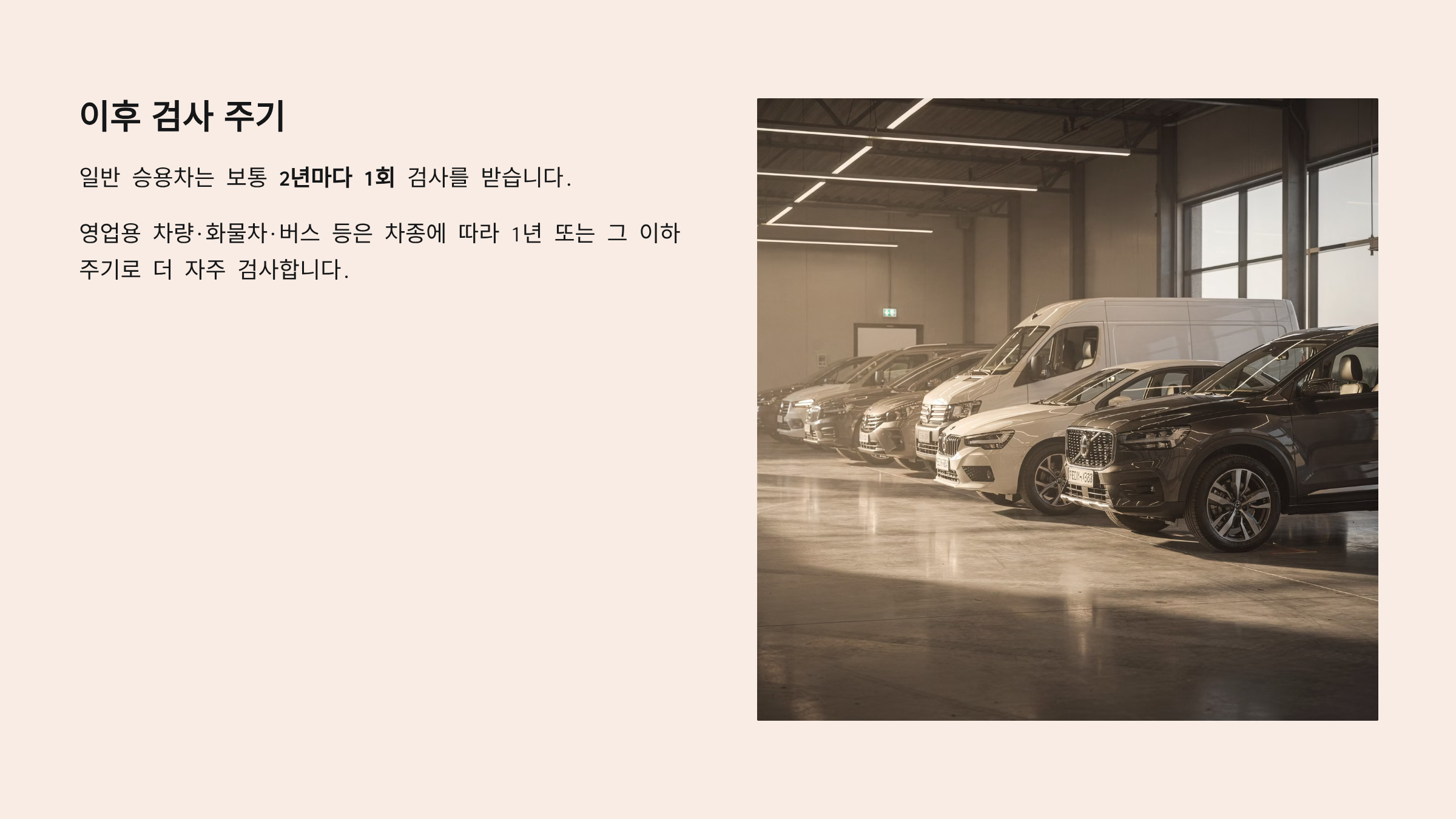 - 영업용 차량·화물차·버스 등은 차종에 따라 1년 또는 그 이하 주기로 더 자주 검사합니다.