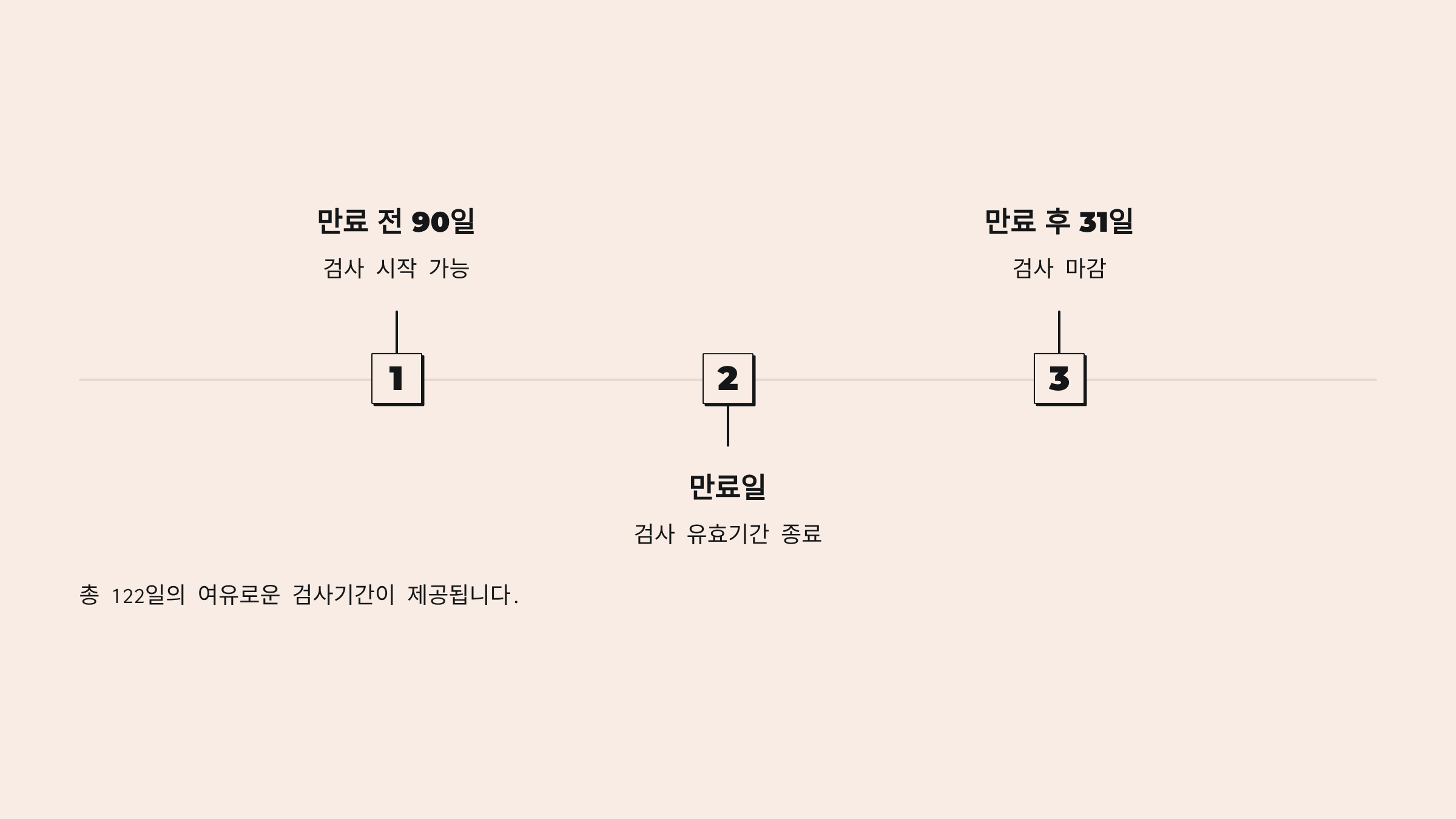 - 수검 가능기간(검사받을 수 있는 기간): 유효기간 만료일 전 90일 ~ 후 31일(총 122일)입니다.
