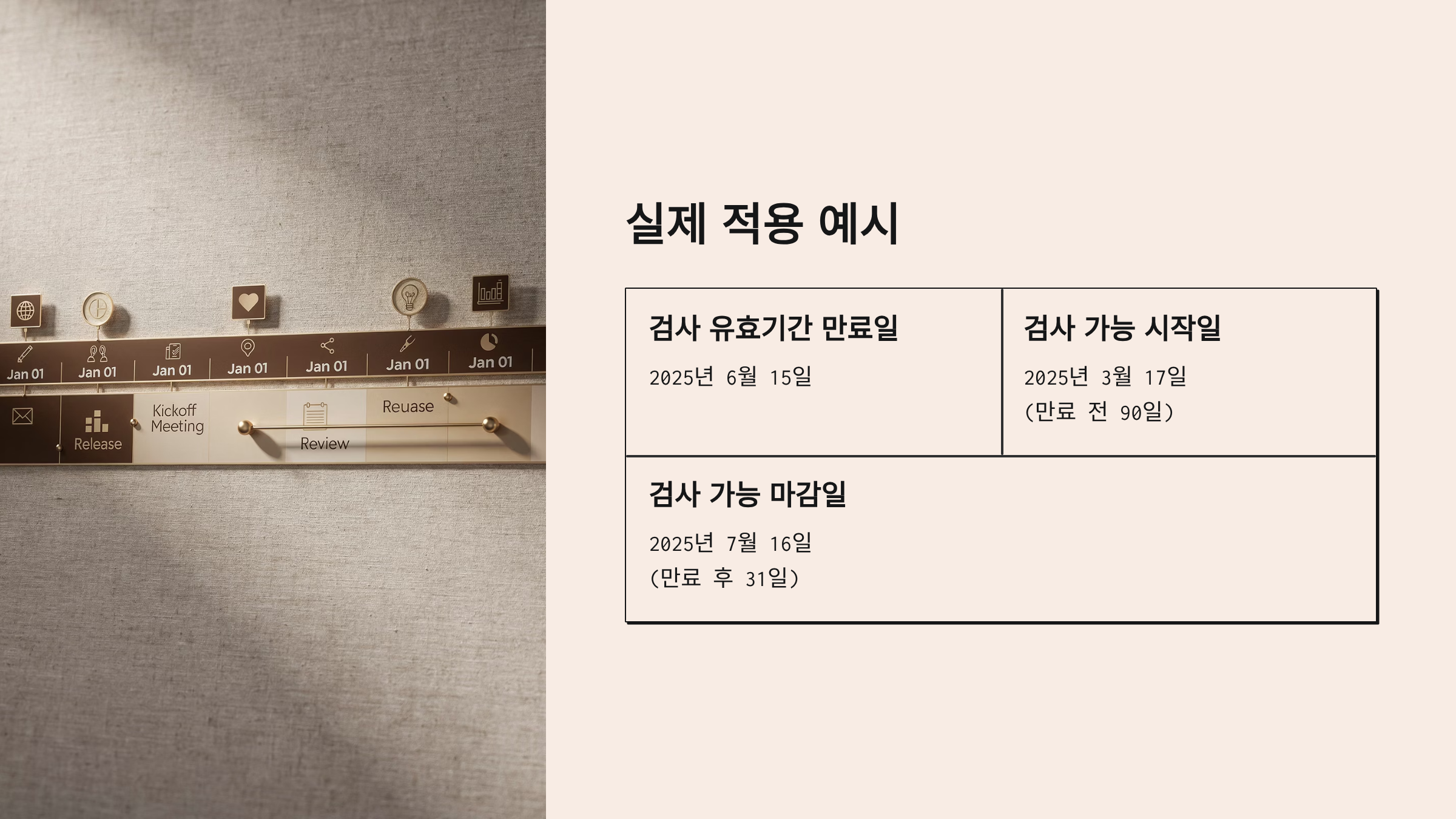 - 유효기간·검사 가능기간(전 90일, 후 31일) 확인.