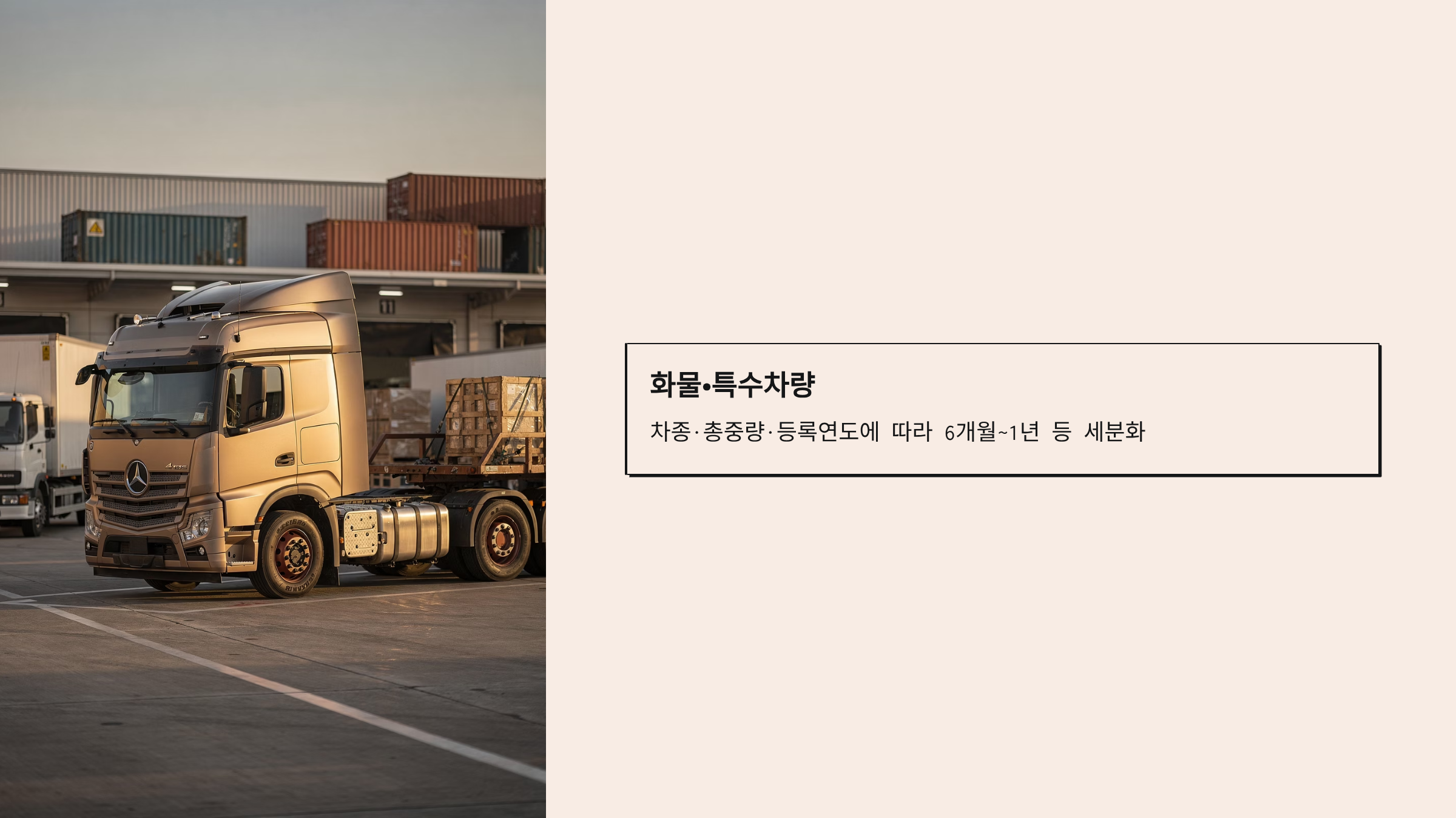 - 화물·특수차량: 차종·총중량·등록연도에 따라 6개월~1년 등 세분화.