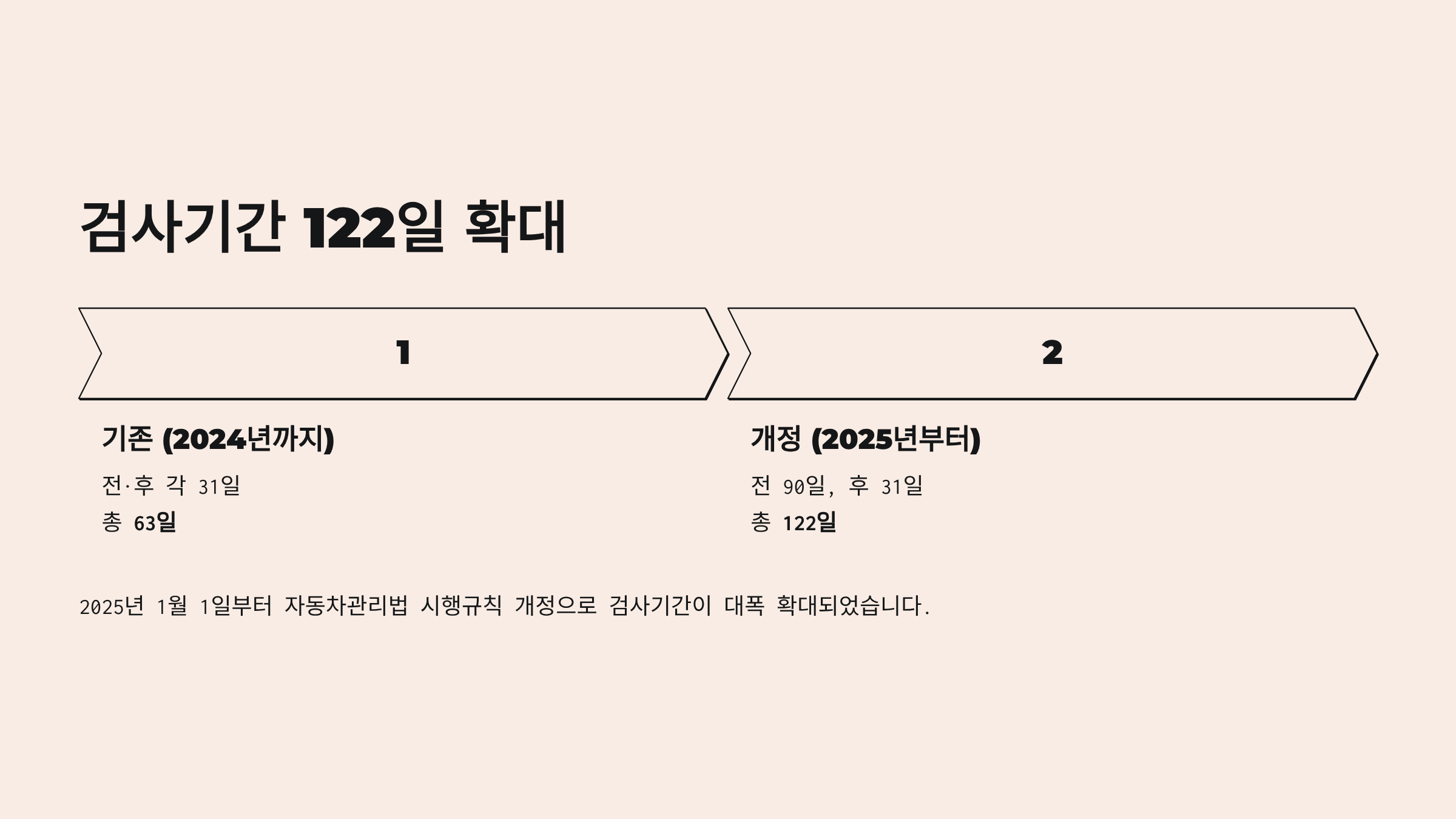 하지만 2025년 1월 1일부터 자동차관리법 시행규칙 개정으로 전 90일, 후 31일, 총 122일로 대폭 확대되었습니다.
