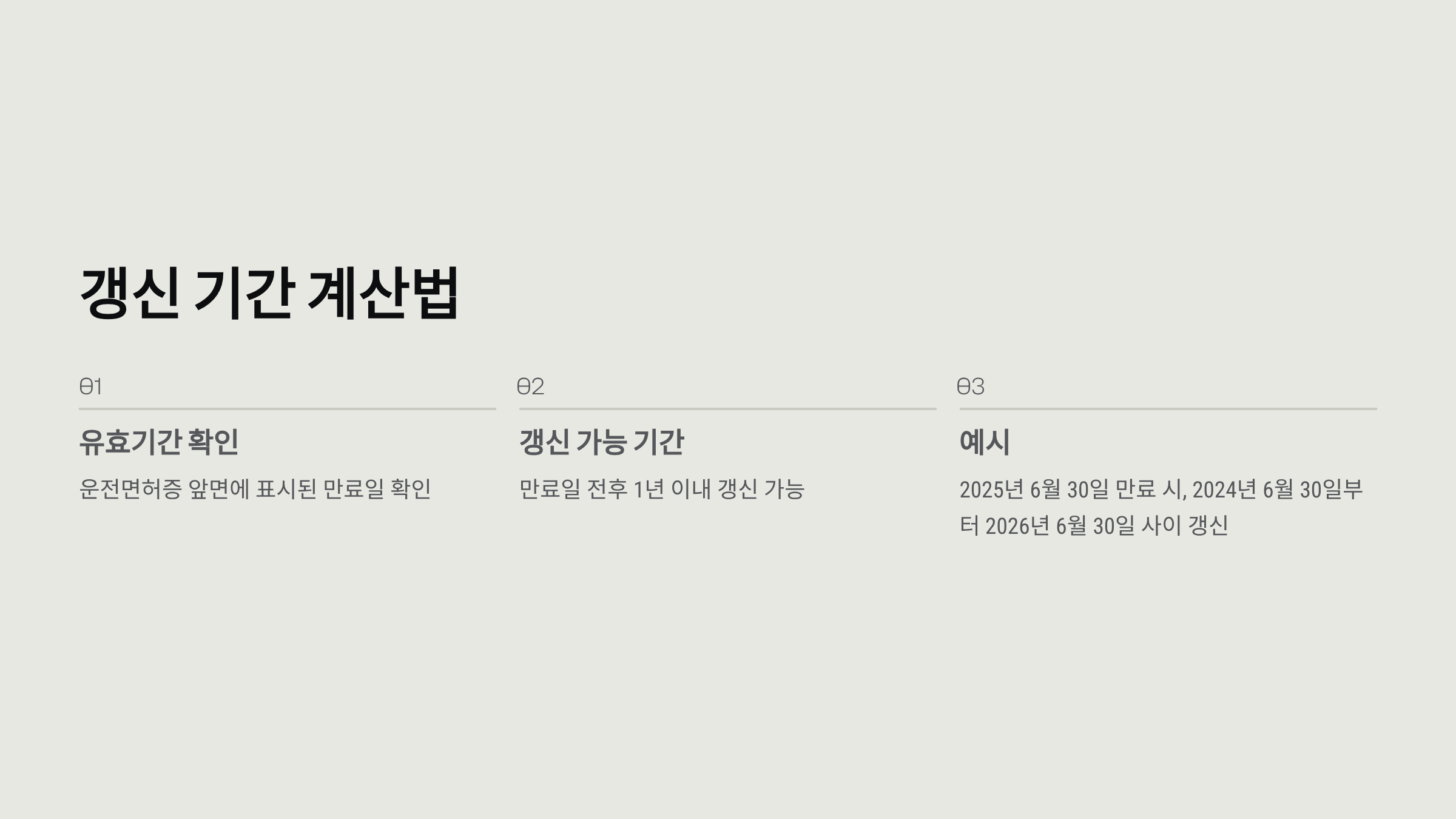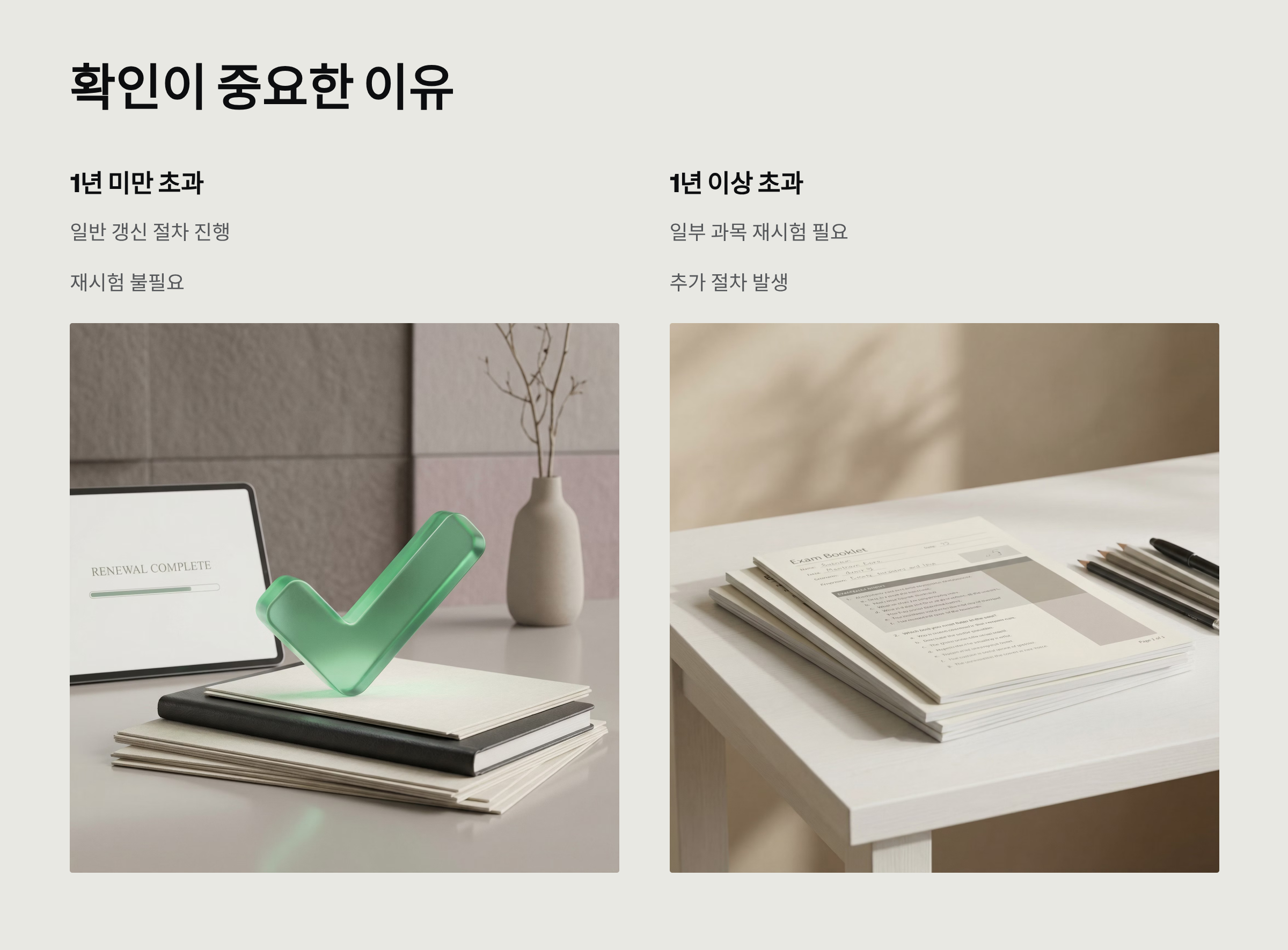 - 1년 미만 초과: 일반 갱신 절차 진행 (재시험 불필요)